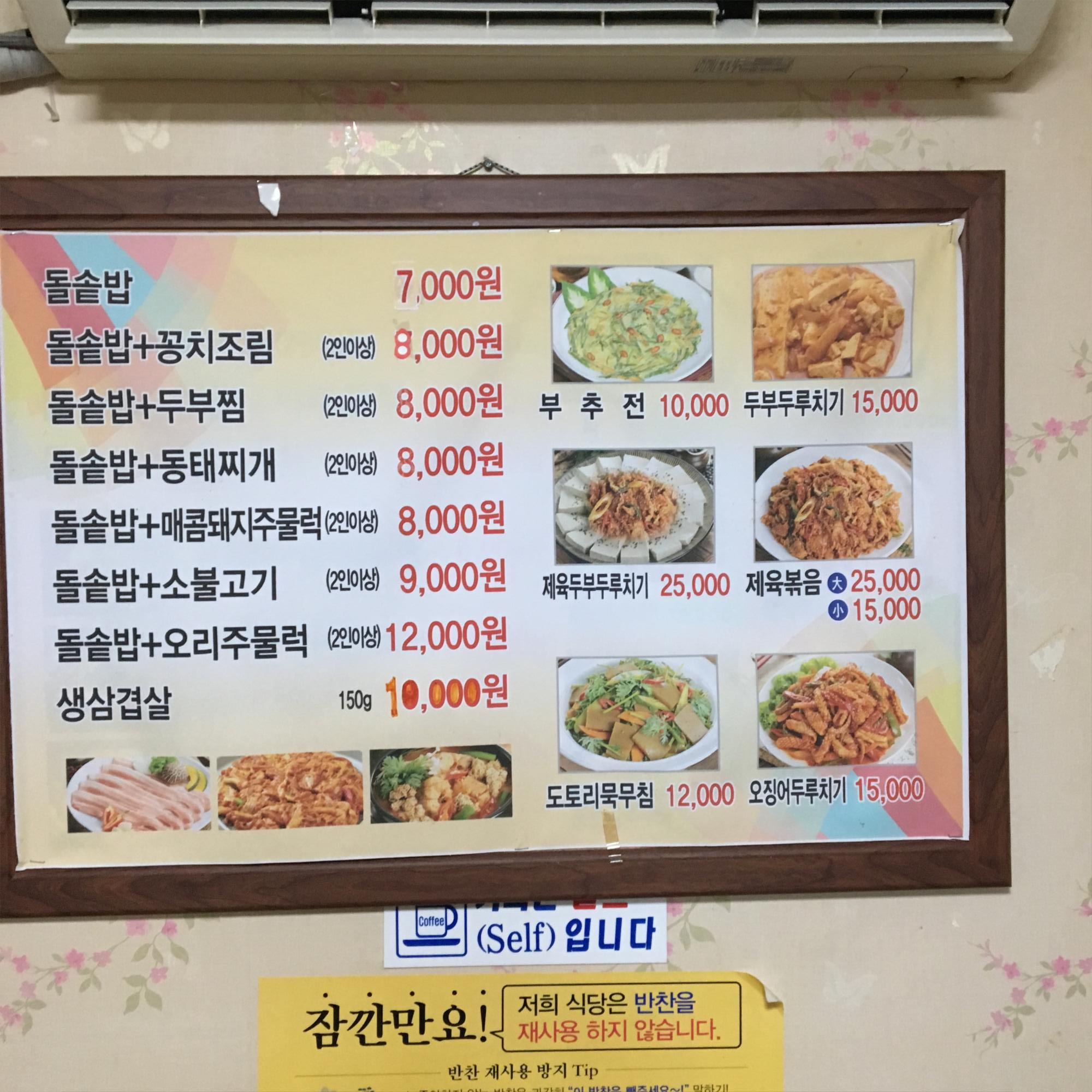 기본돌솥밥은 7000원이고, 꽁치조림, 두부찜, 동태찌개, 매콤돼지주물럭 등을 추가하면 1000원~2000원정도 더 붙습니다.