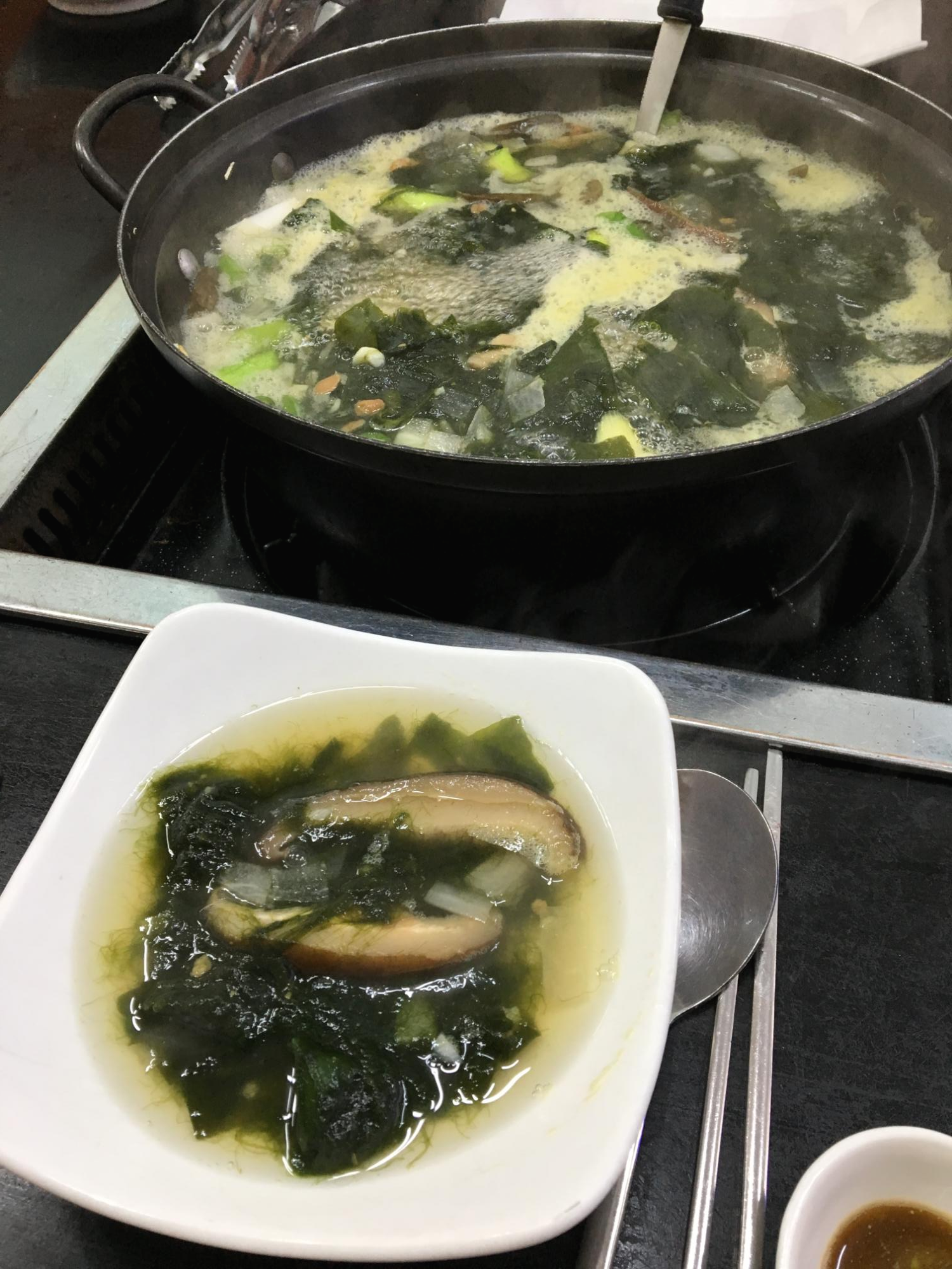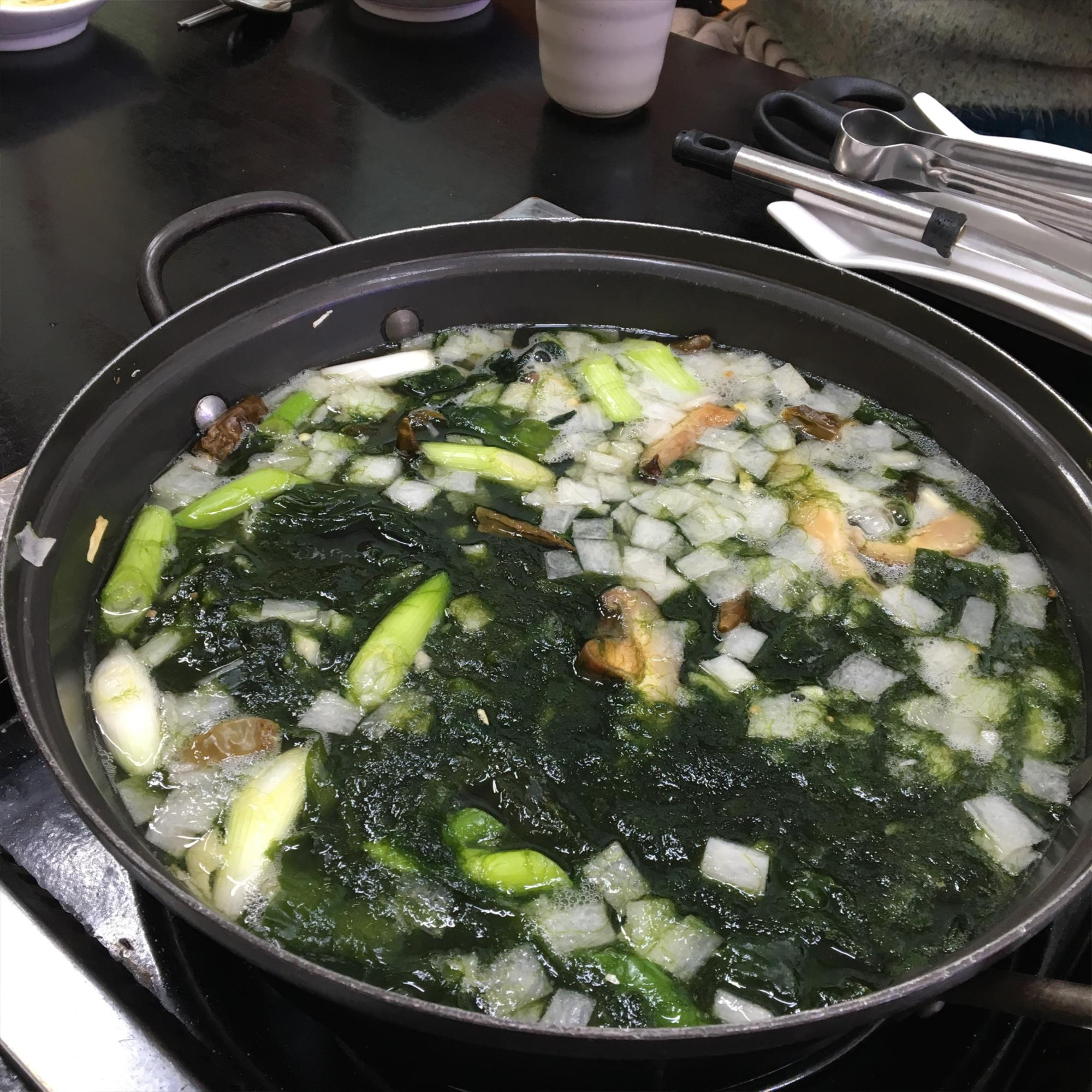 조개와 전복이 익어가는 동안 국물을 떠먹었는데, 국물에 파래가 푸짐하게 들어있었습니다.