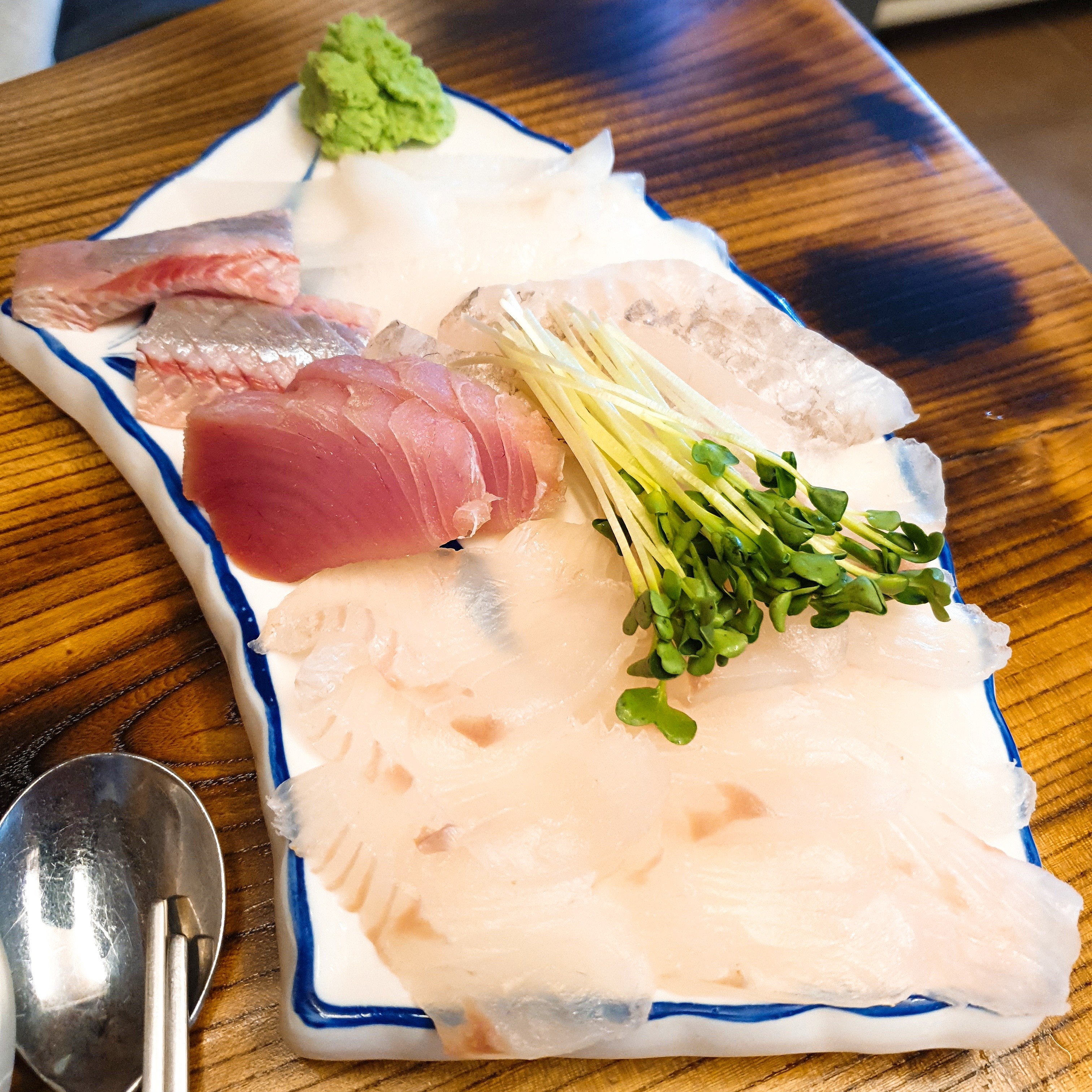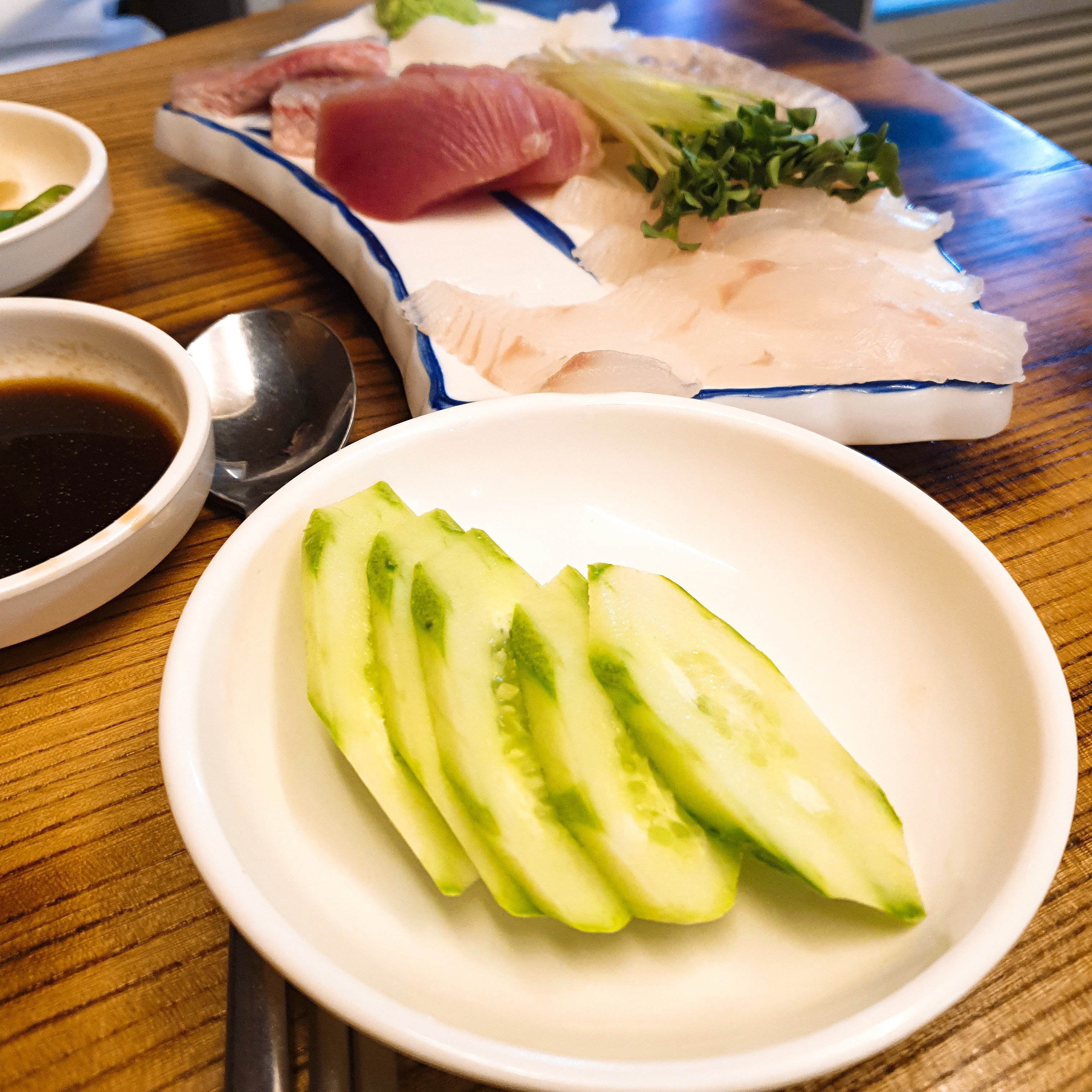 기본 찬은 이렇게 주십니다. 특히 저 소스가 정말 맛있습니다. 저는 간장고추냉이파인데, 여기선 꼭 저 소스를 찍어먹어야 합니다.
