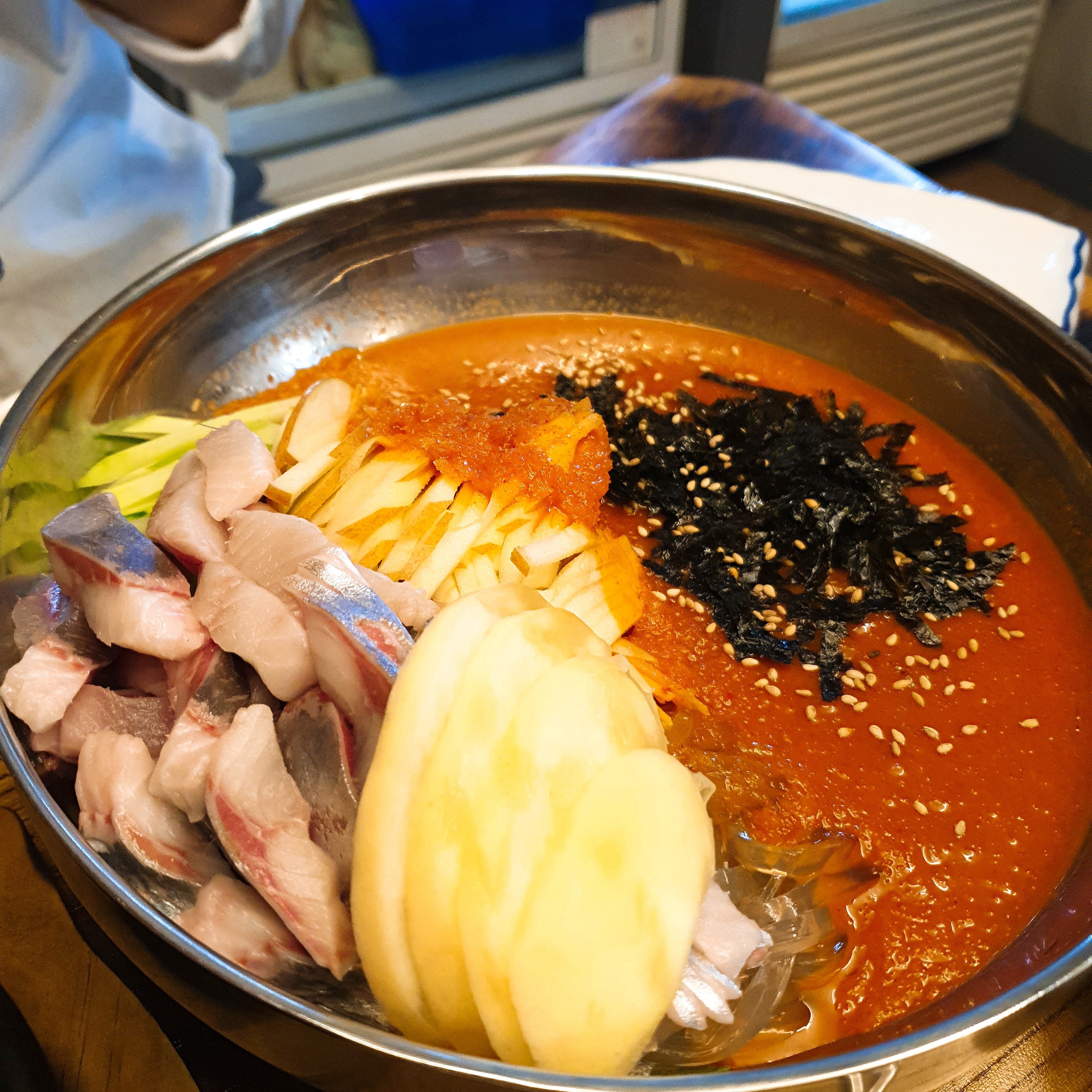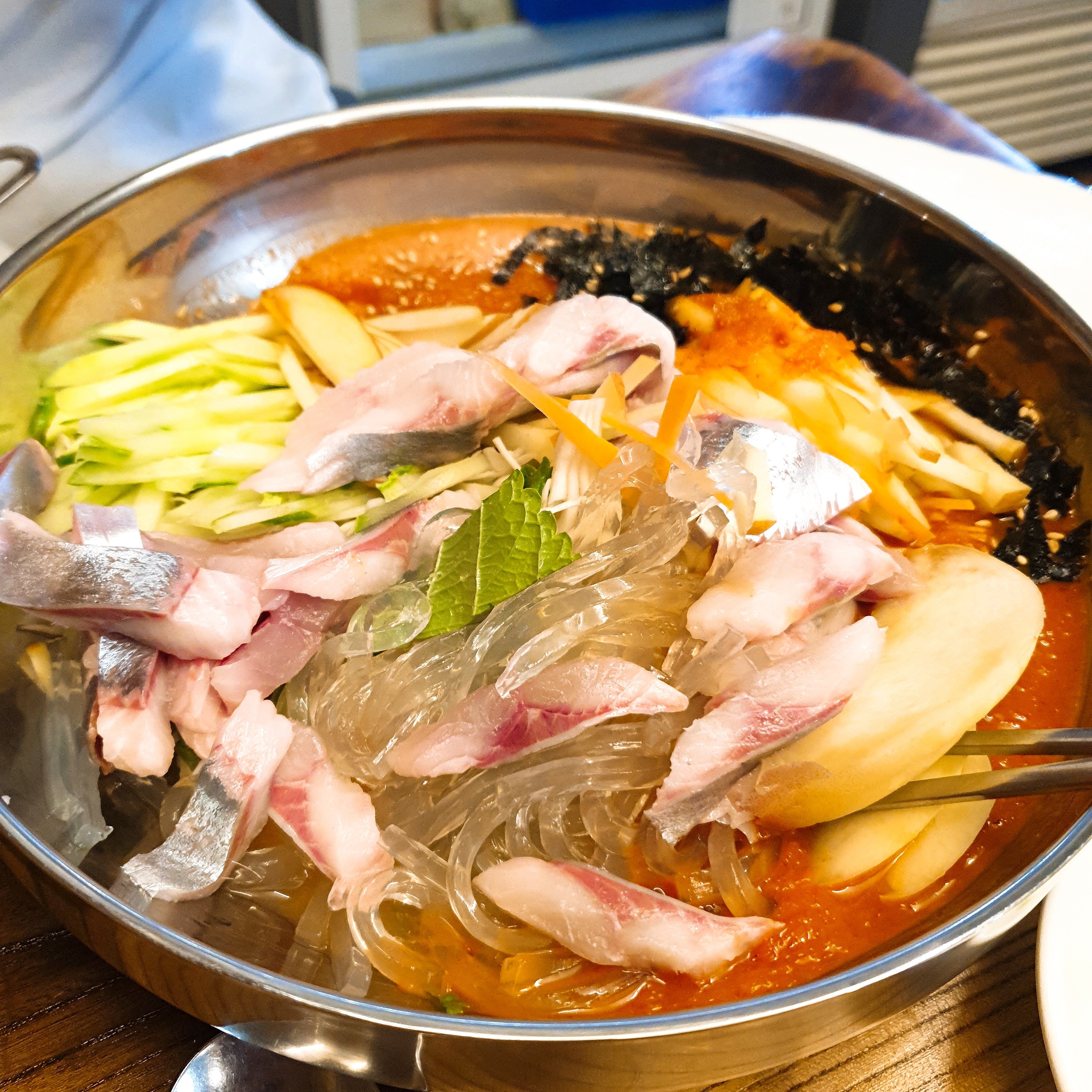 들어간 회가 감동입니다. 그리고 각종 과일과 면까지.. 이런 물회는 처음봅니다.