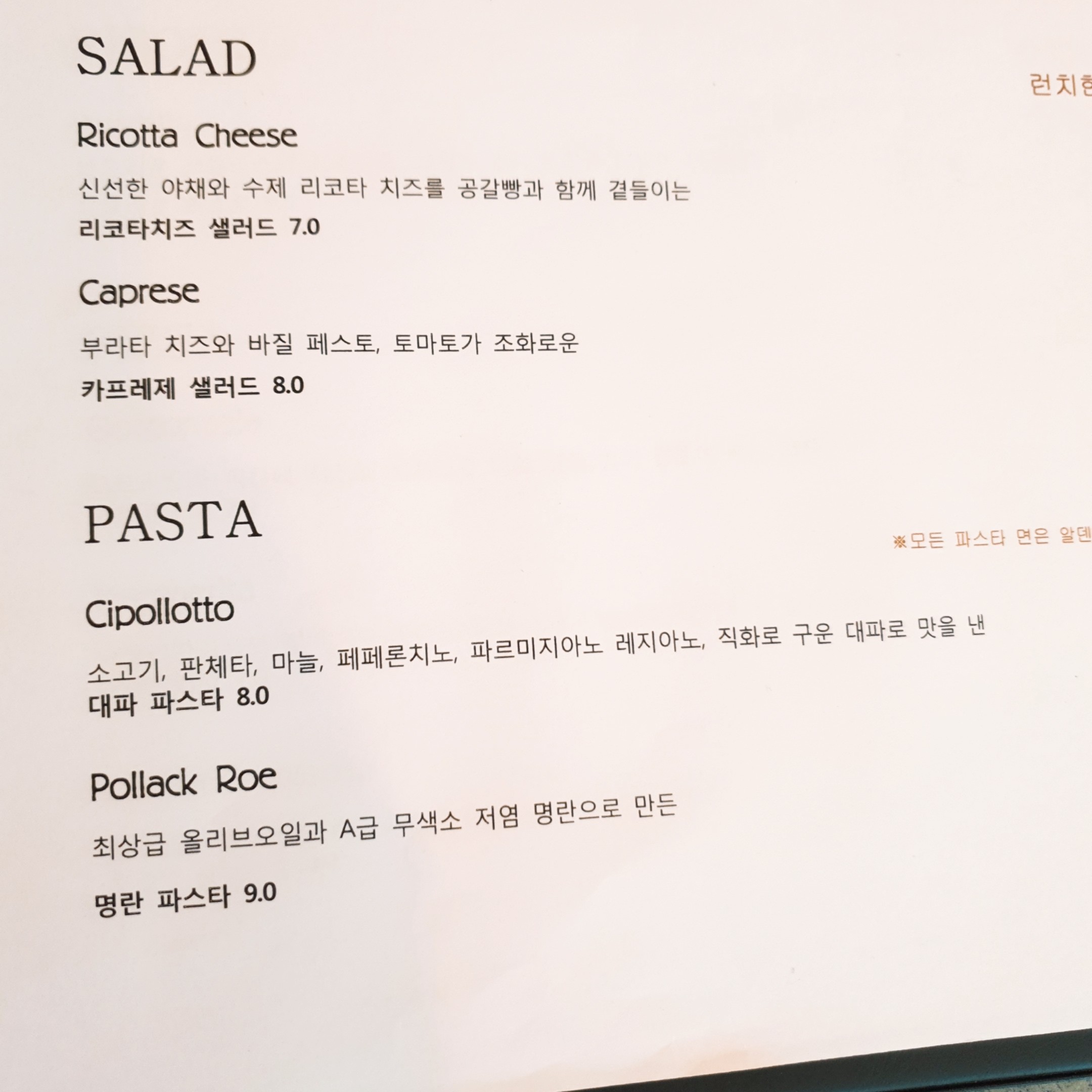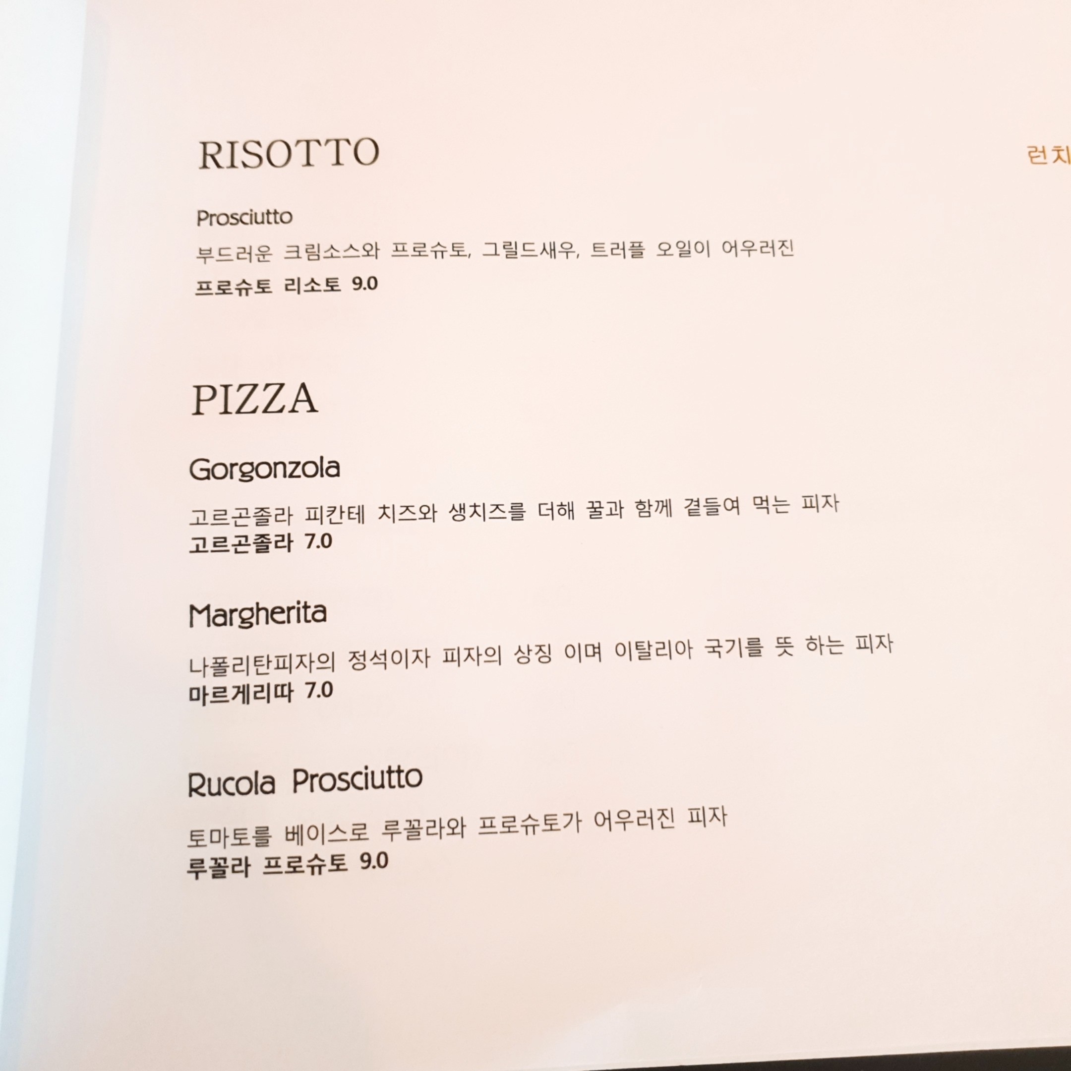 저희는 '대파파스타', '프로슈토 리조또', '마르게리따 피자' 세가지 메뉴를 시켰습니다.
