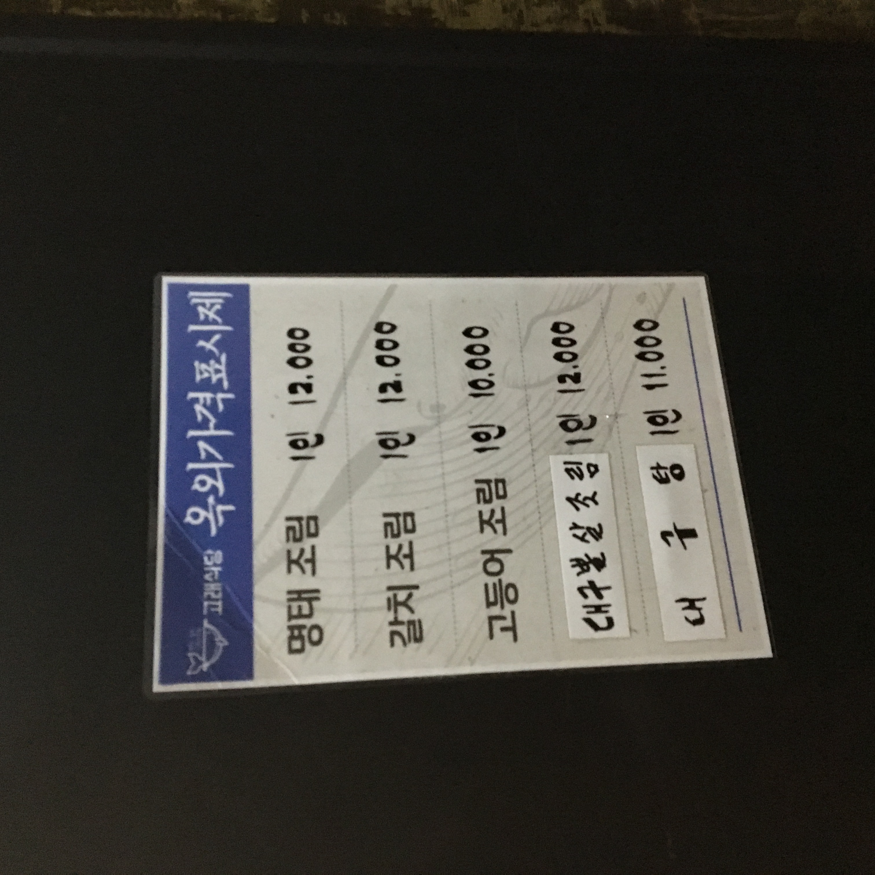 고래식당 메뉴입니다. 명태조림, 갈치조림, 고등어조림, 대구뽈살조림으로 '조림'류가 주를 이룹니다.