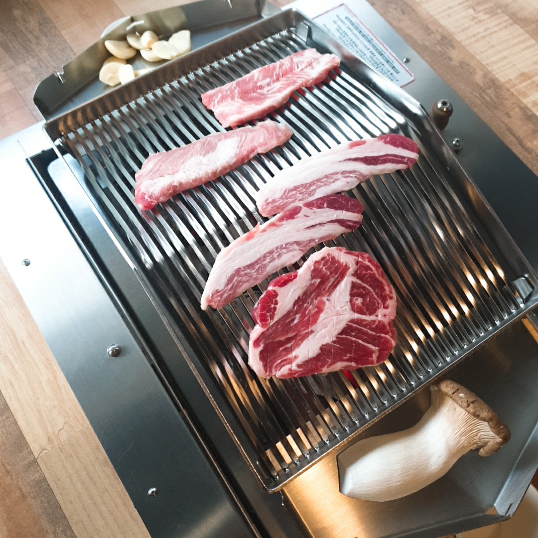 이렇게 다 익은 고기는 사이드에 빼놓으면 적당한 열기로 인해서 식지 않고, 그렇다고 바싹 구워지지도 않아서 맛있는 고기를 긴 시간 드실 수 있습니다.