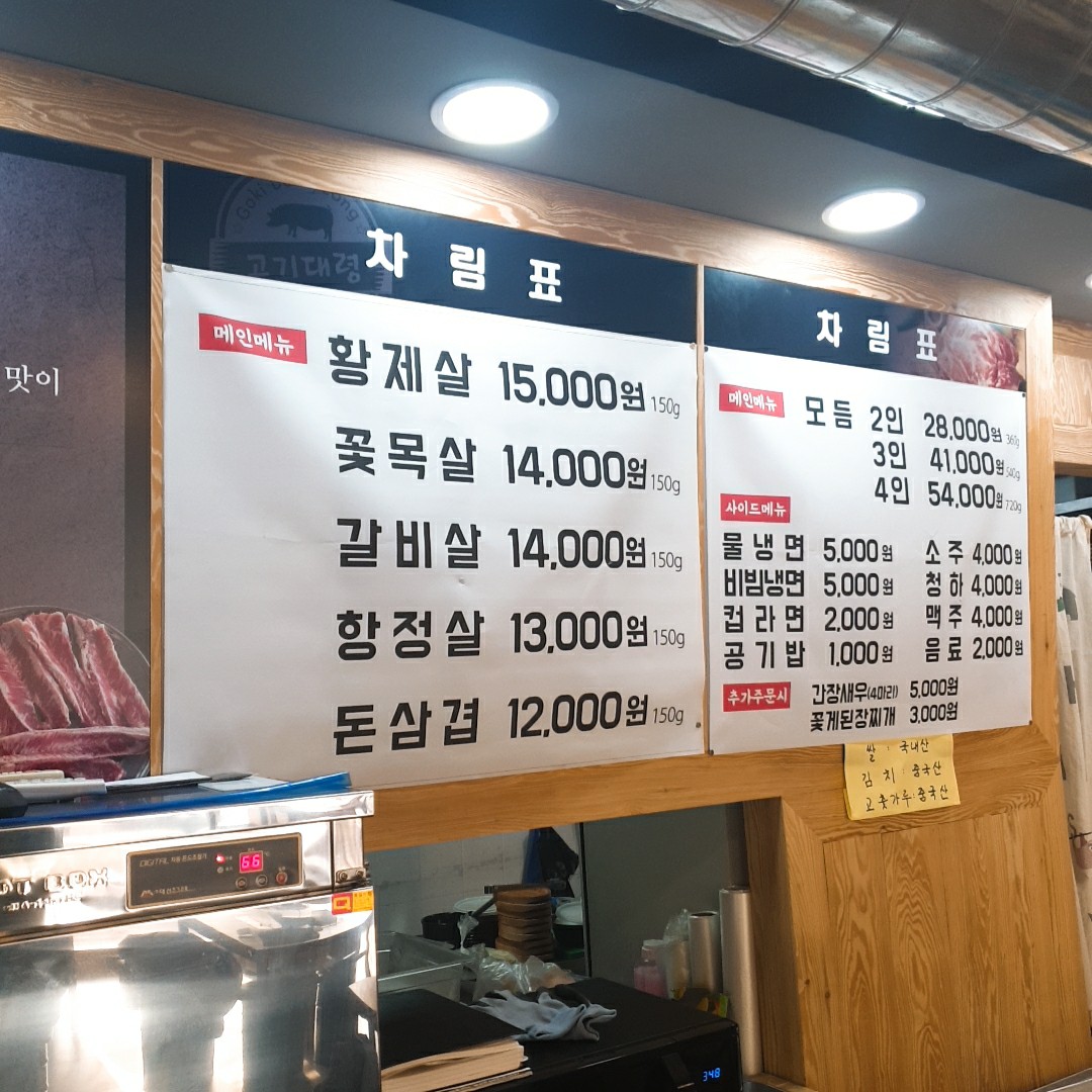 고기대령 메뉴입니다. 황제살, 꽃목살, 갈비살, 항정살, 돈삼겹 등 부위별로 메뉴가 있는데, 처음 가서 잘 모를때는 뭐니뭐니해도 '모듬'을 시켜서 다 맛봐야죠 ㅎㅎ