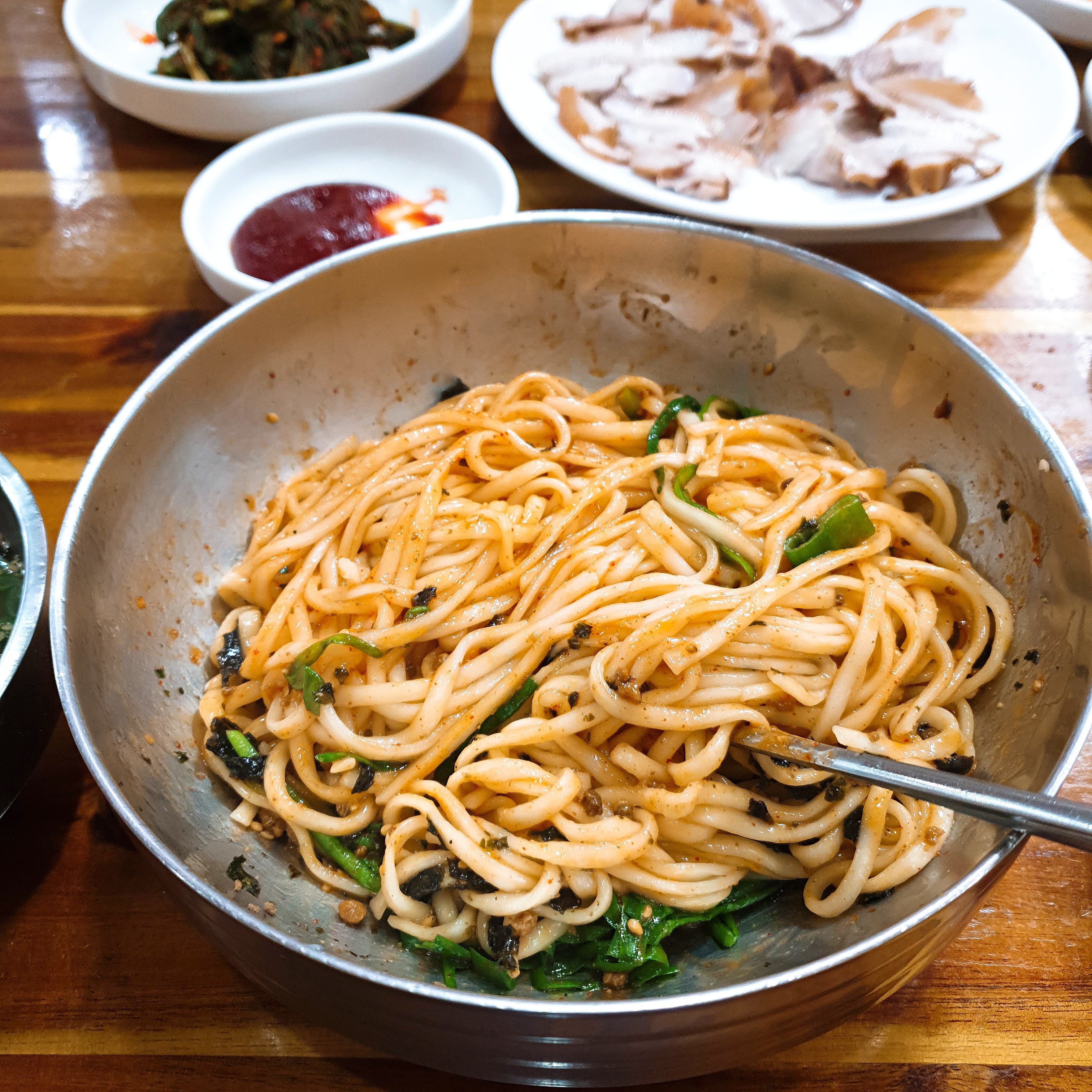 와.. 이게 진짜 어떻게 표현해야할지 모르겠네요. 칼국수 특유의 그 꾸덕꾸덕한 맛 있죠? 샤브샤브도 칼국수 넣으면 그렇게 변하잖아요? 그게 온전히 살아있는 비빔국수랄까요..