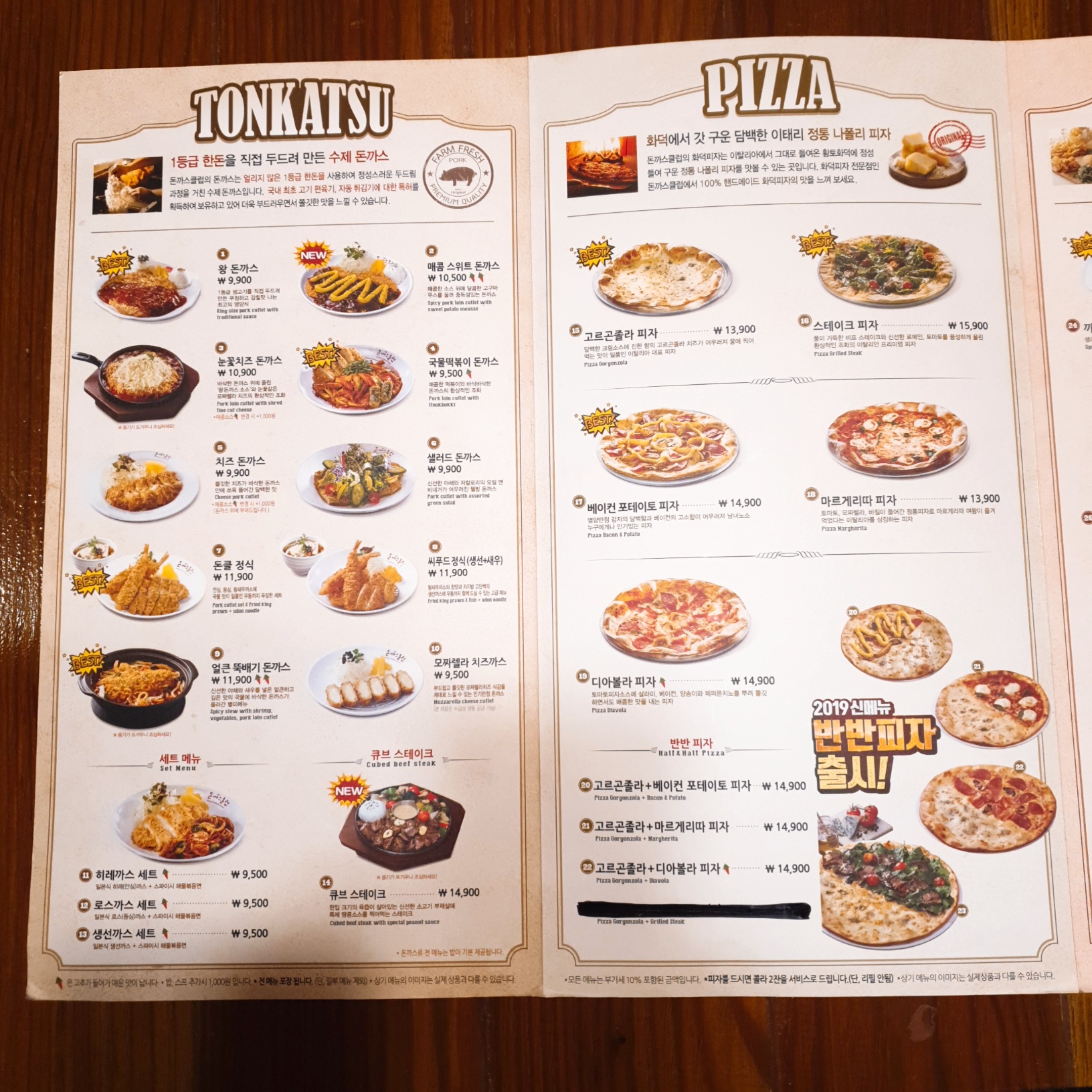돈까스, 샐러드, 스테이크, 피자, 파스타 거기에 덮밥까지 준비되어 있습니다.