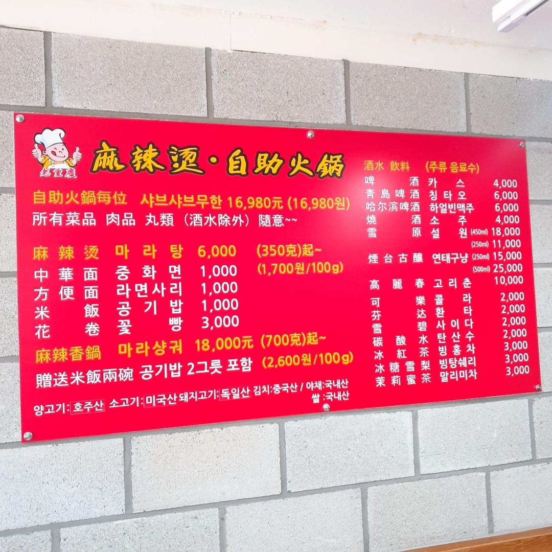 로충칭 메뉴입니다. 마라탕은 아시다시피 내가 먹고픈 재료를 통에 담아서 가져다주는거라 무게에 따라 가격이 달라지죠.