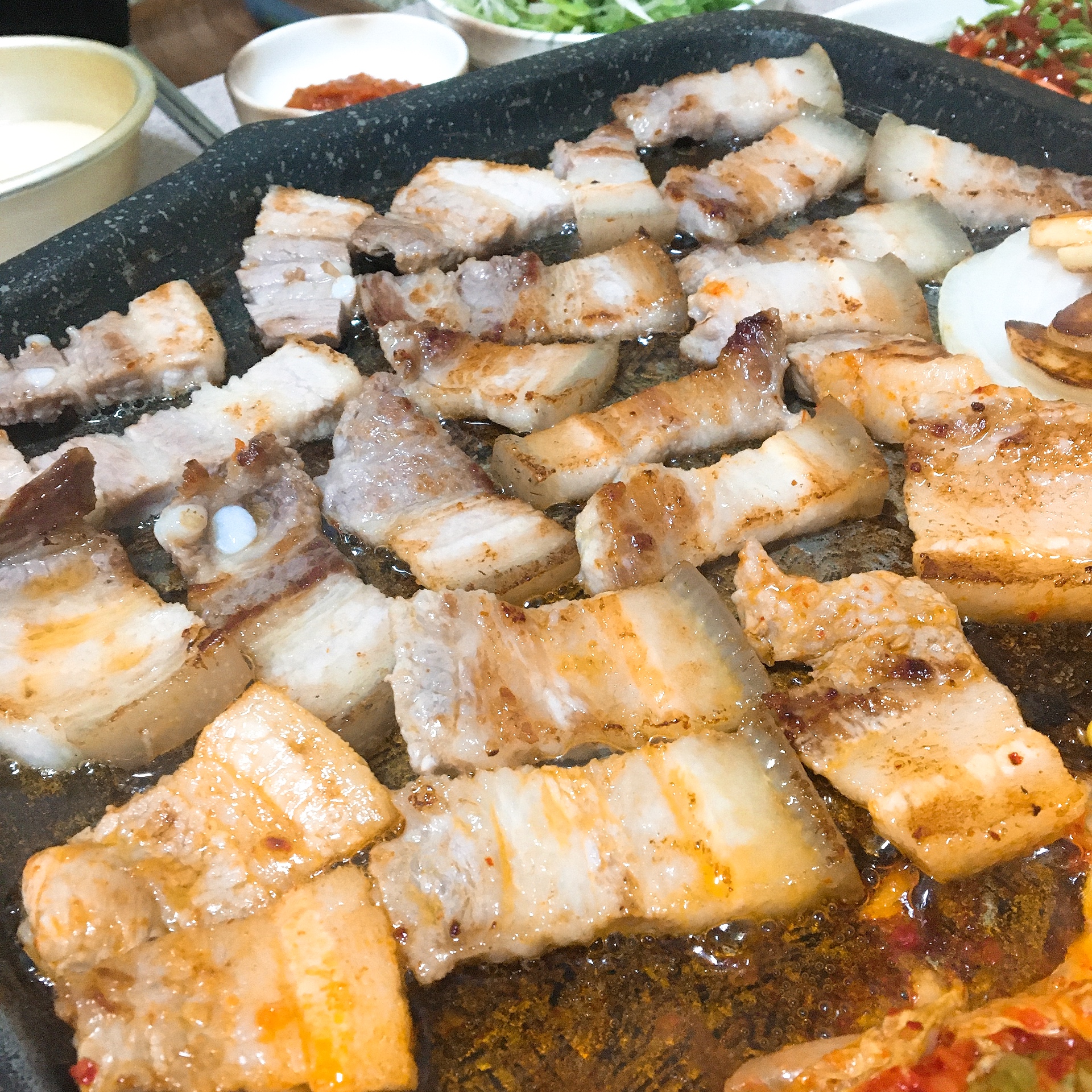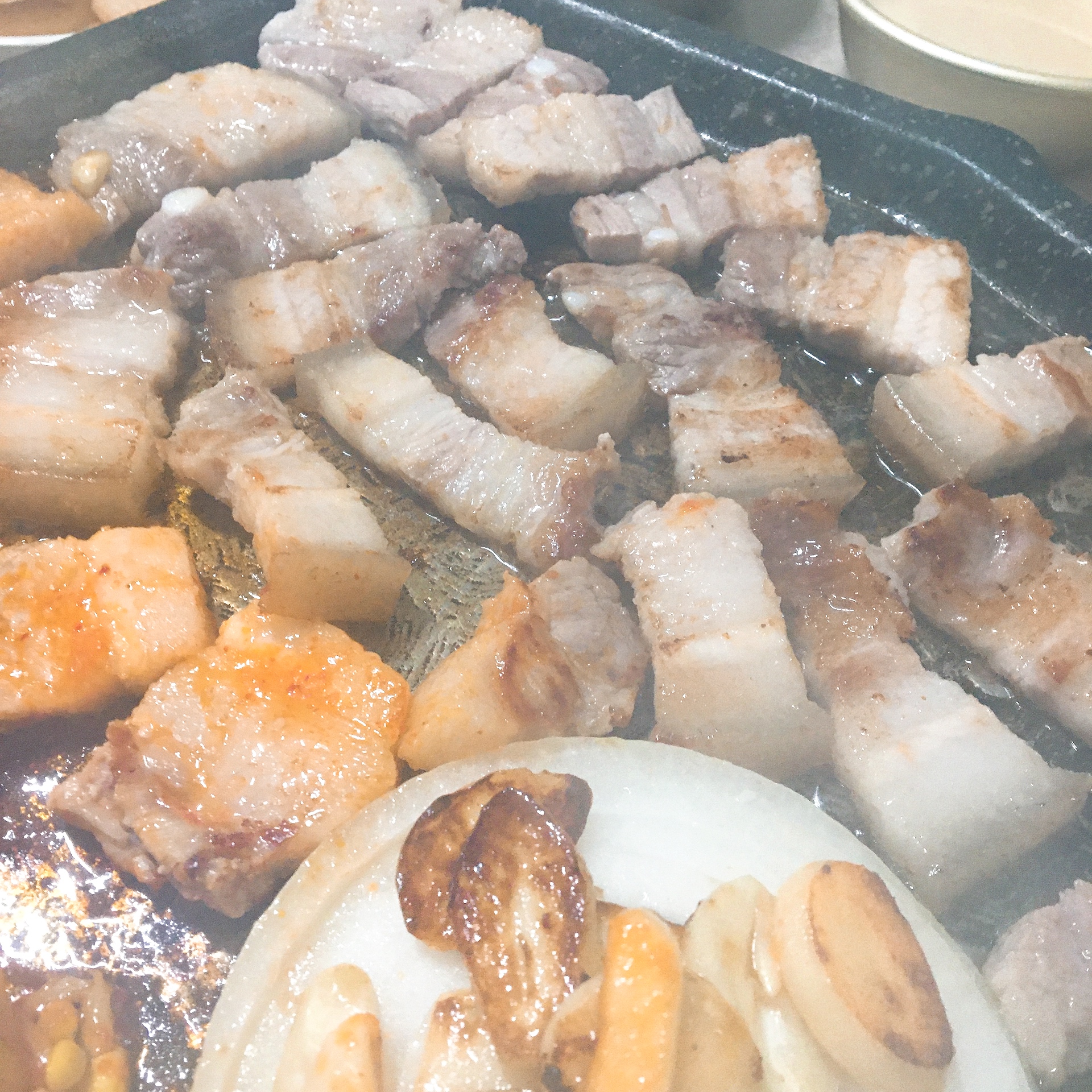 삼겹살 똭 얹어서 마늘 양파와 함께 굽기 시작했습니다.