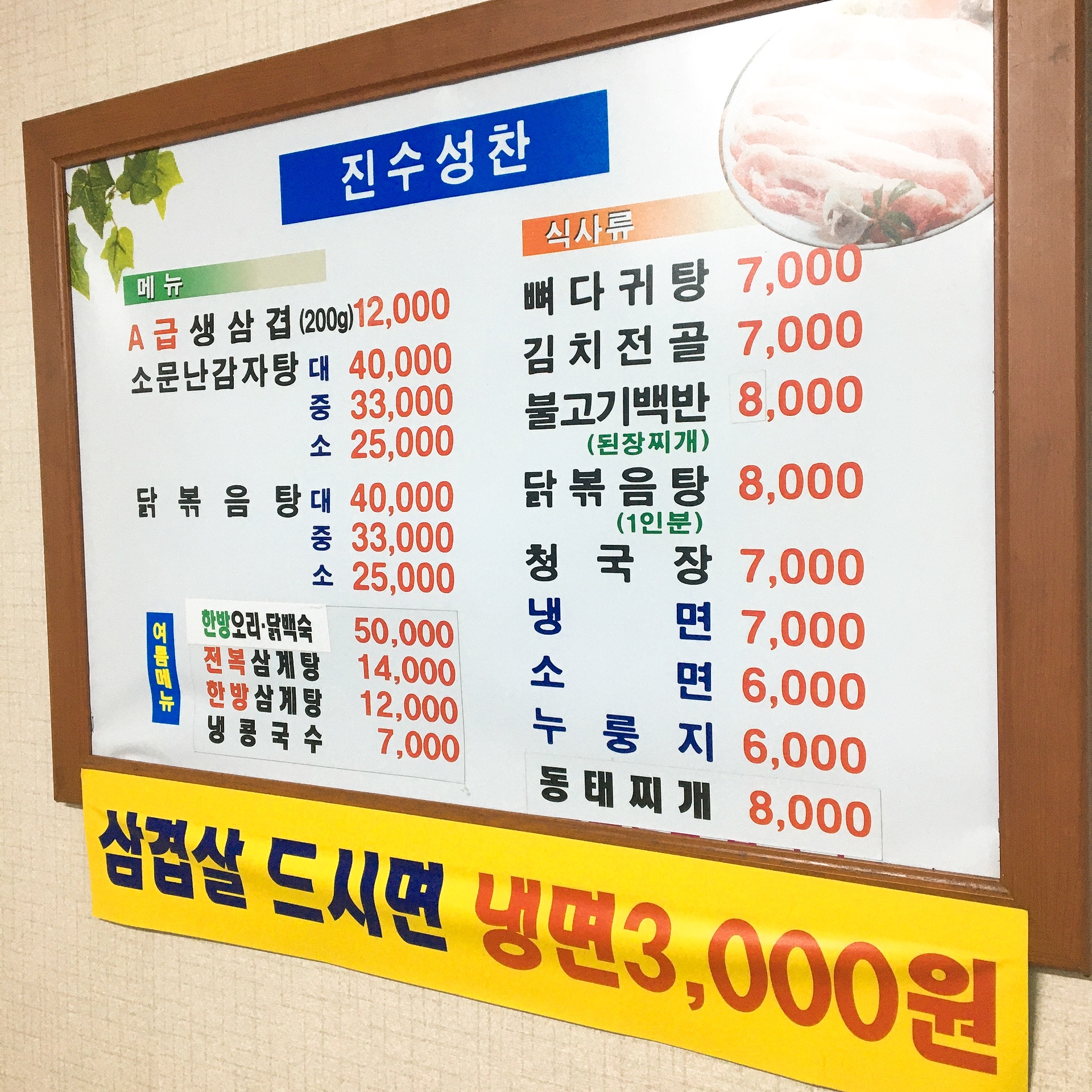 여름에는 삼계탕이나 오리백숙도 드실 수 있으신데, 메인메뉴는 뭐니뭐니해도 삼겹살인 것 같습니다.