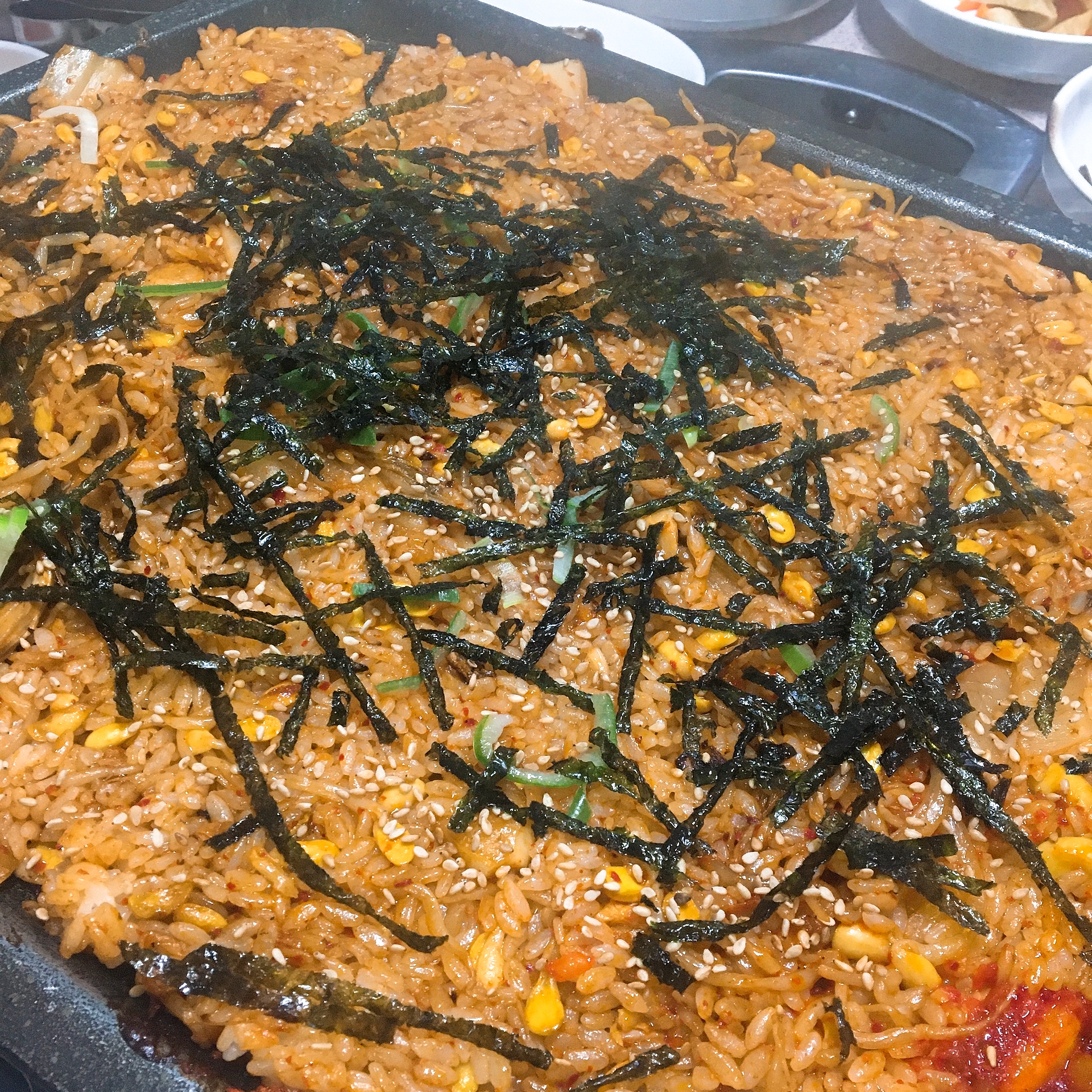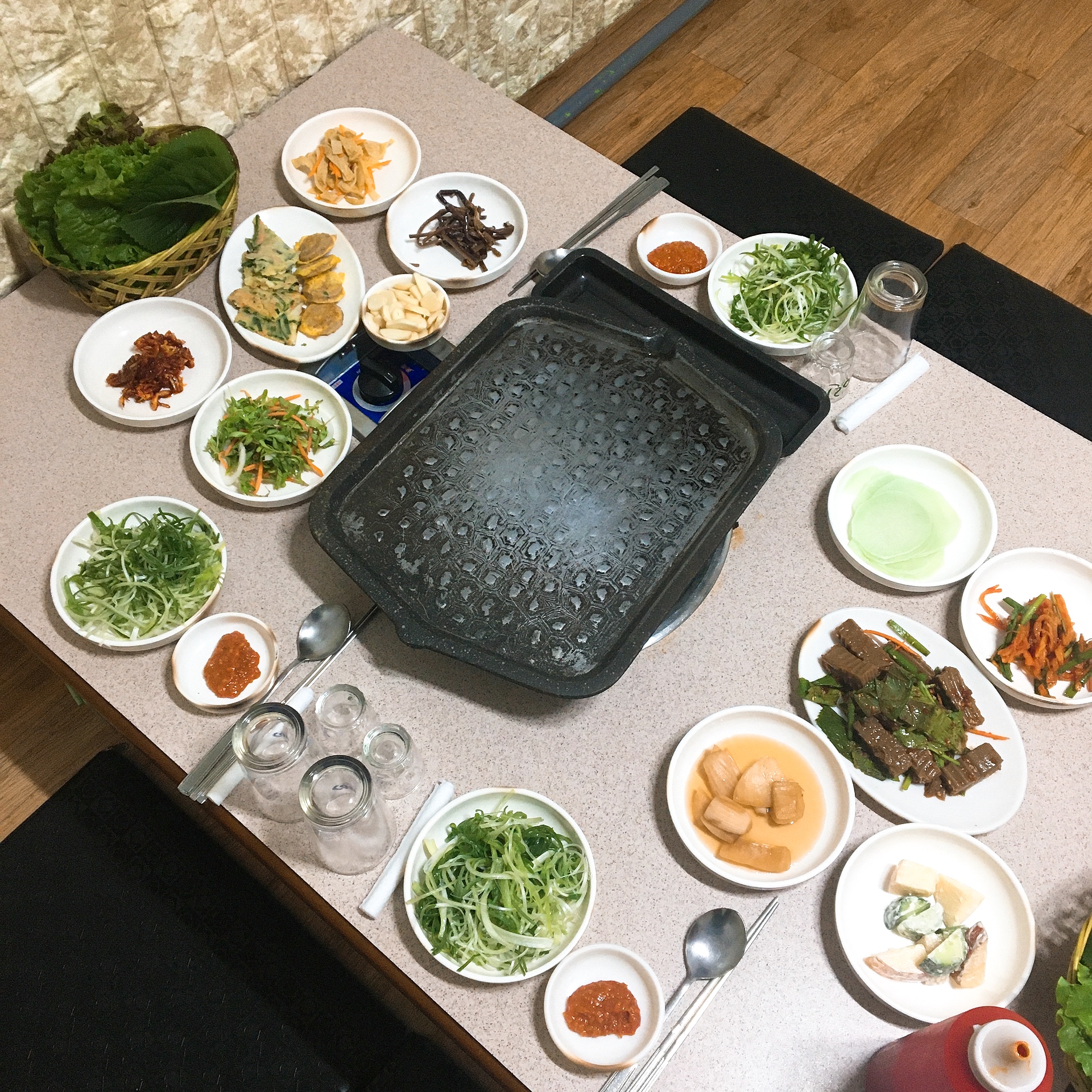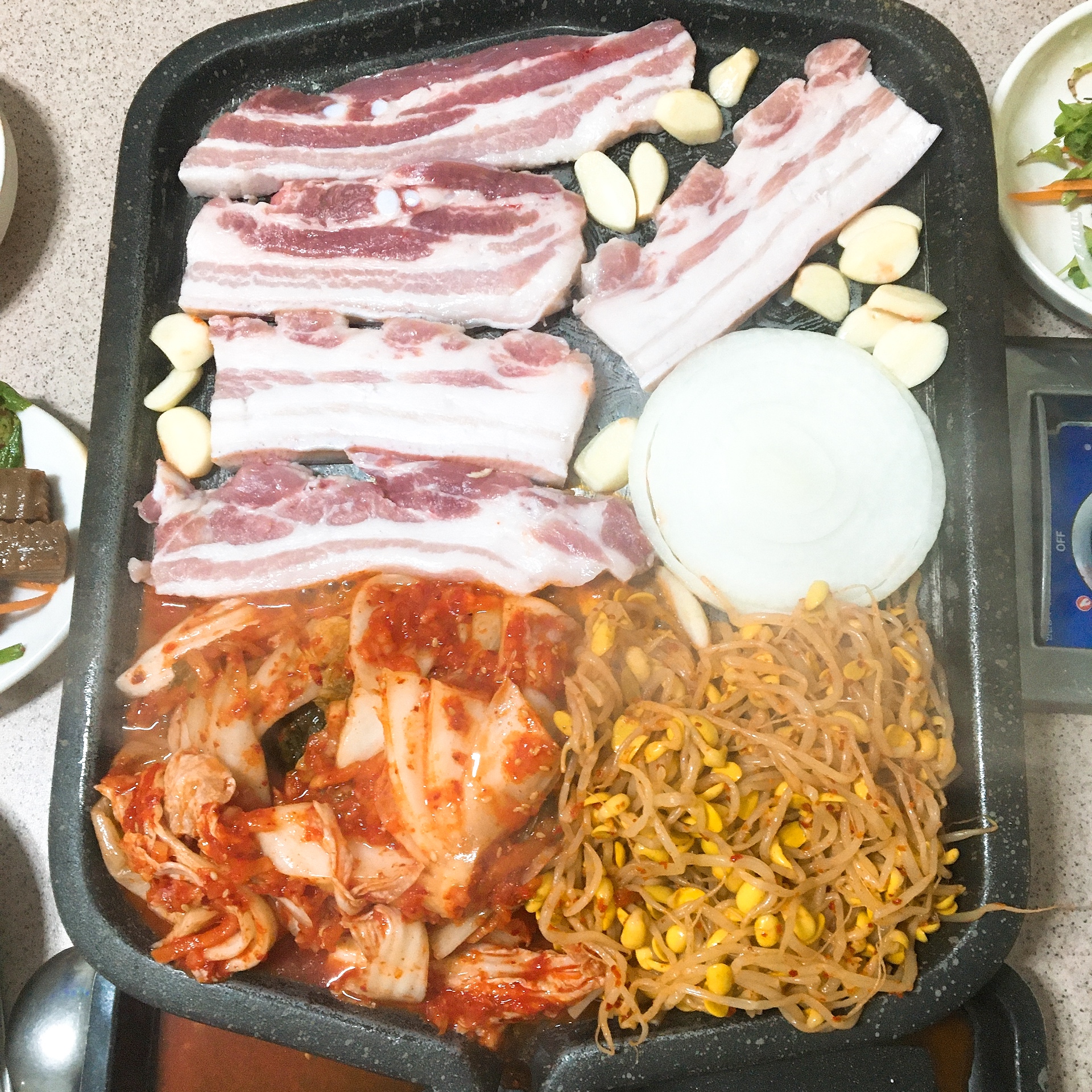 거의 불판의 반정도 차도록.. 처음부터 세팅을 해주셔서 김치 콩나물 부족할 걱정은 안하셔도 됩니다.