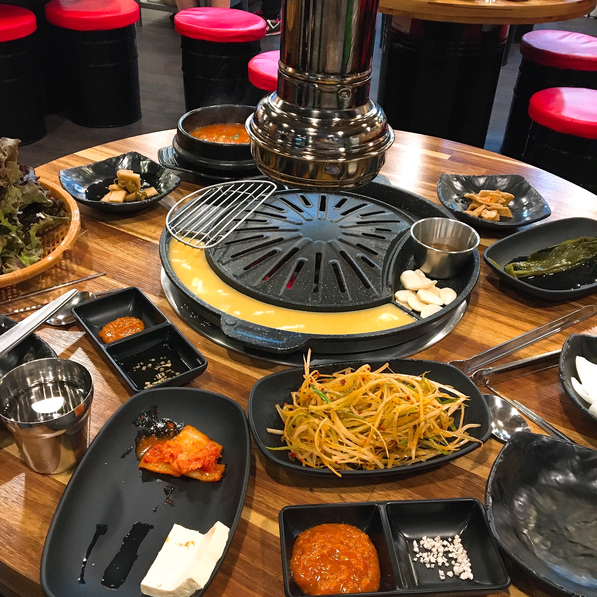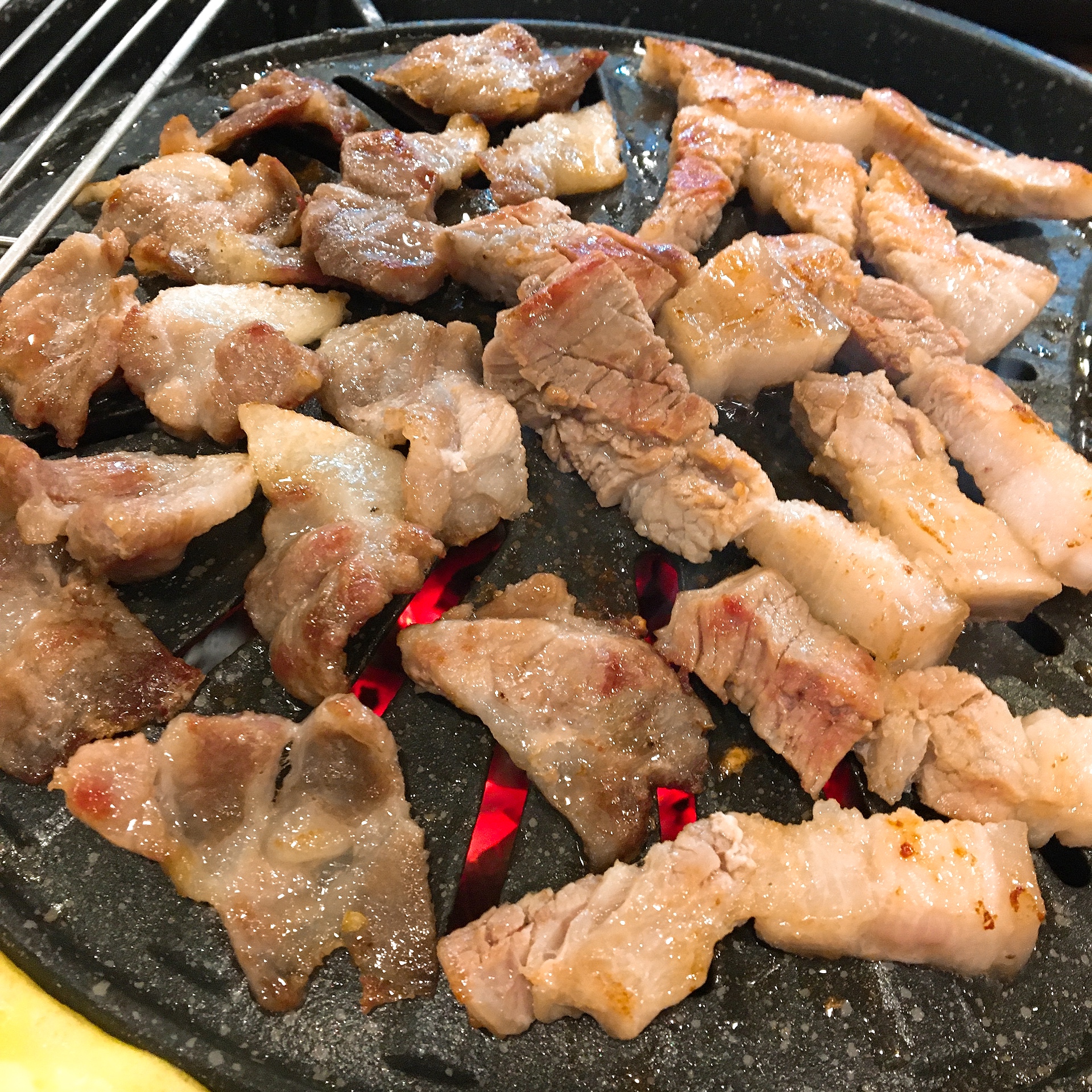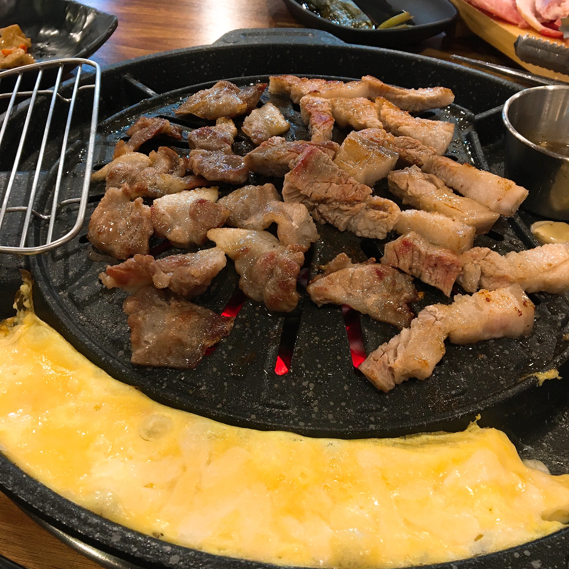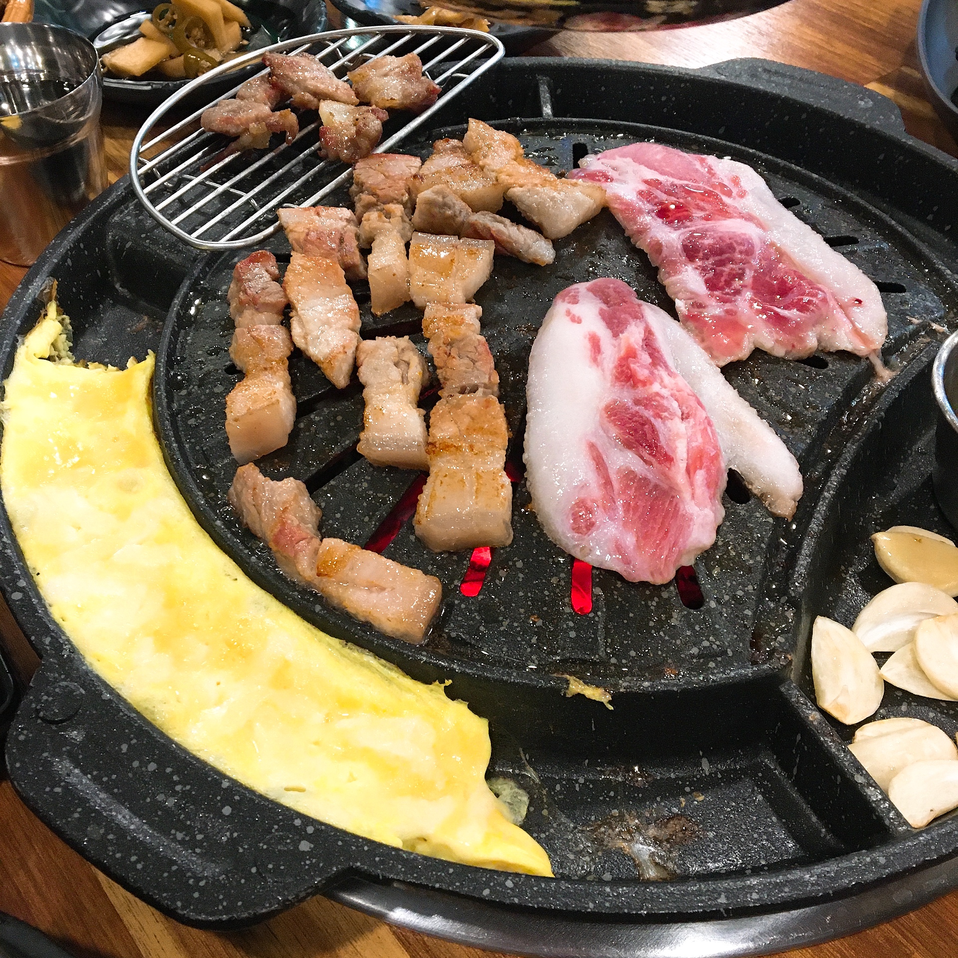 보시다시피 불판 한켠에 계란물과 치즈 부어주셔서 계란찜을 계속 해 먹는 구조였고, 불판이 마늘과 고기 등 동시에 굽기에 좋은 불판이었습니다.