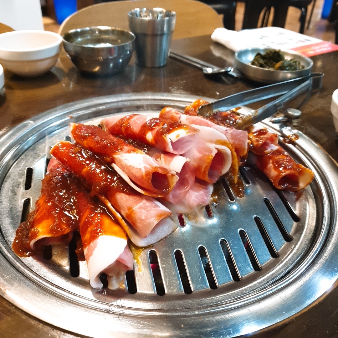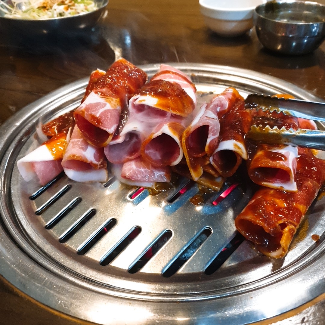 이게 뭐라고 그렇게 맛있을까요? 냉동된 돌돌말린 고기 위에 특제 소스를 쌱 얹어주셔서 내주시면 불판에 고루 펴서 익히시면 됩니다.