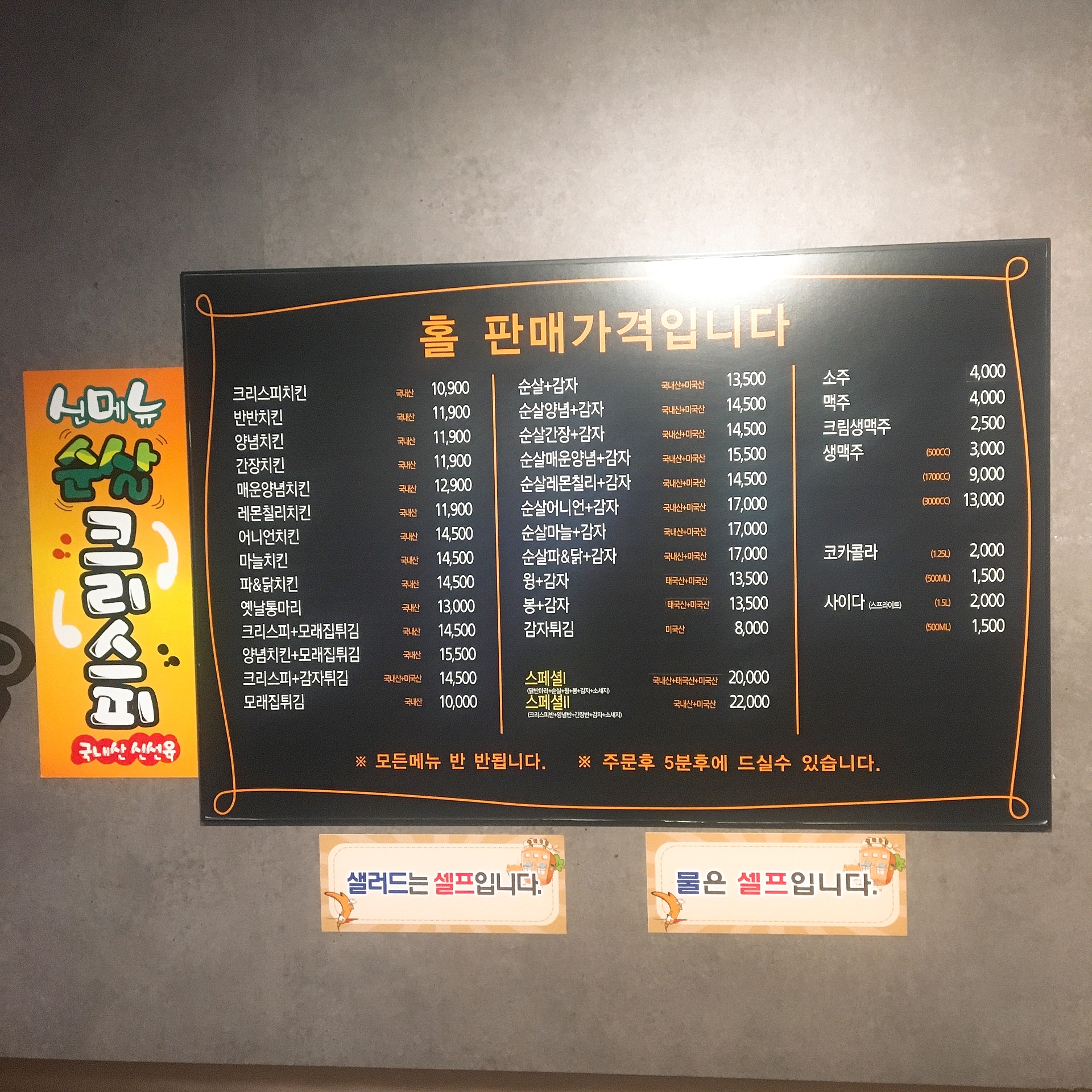그리고 치킨 외에 모래집튀김, 감자튀김 등 안주류도 있어 홀에서 맥주한잔 드시기에도 좋은 가게입니다.