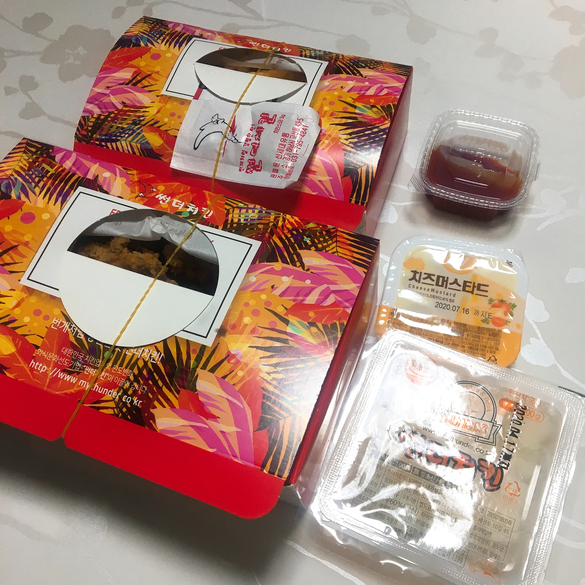 구성은 아래 큰 박스는 치킨, 위 작은박스는 감자, 그리고 치킨무와 따로 산 치즈머스타드소스와 감자 찍어먹을 케쳡이 들어있습니다.