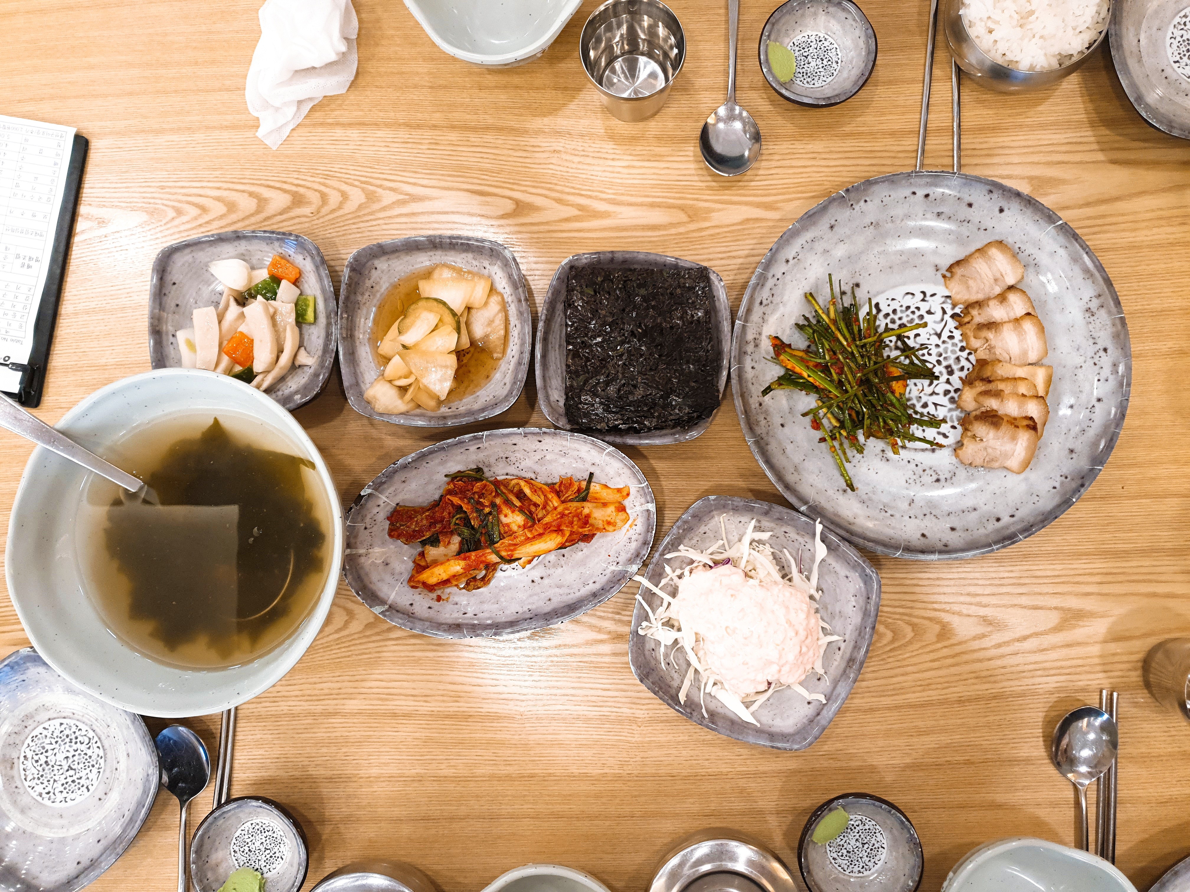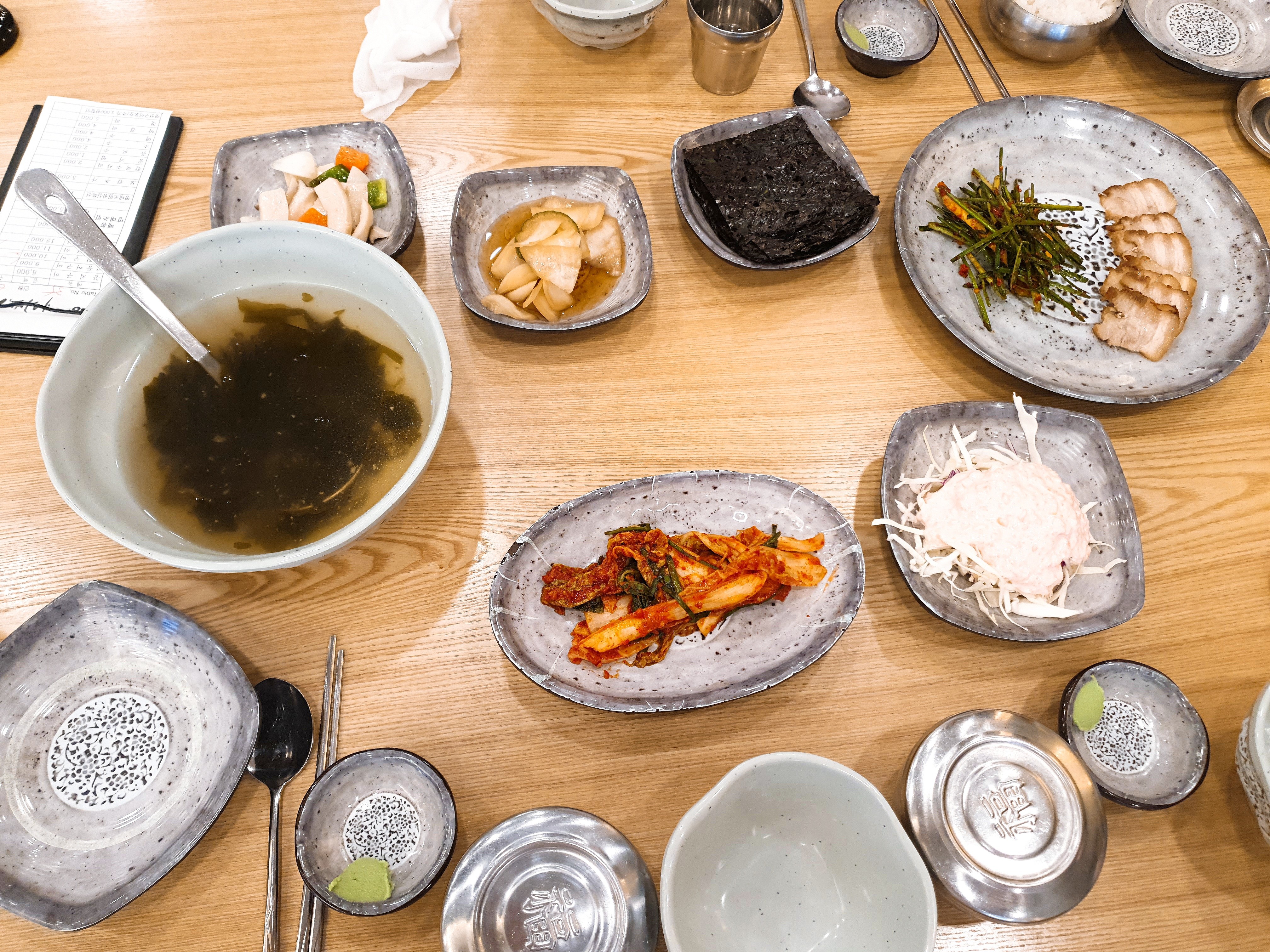 일단 어식백세는 기본적으로 주시는 찬들이 매력적인데요, 미역국부터 시작해서 김장김치, 샐러드, 양파절임, 버섯볶음 그리고 수육을 주십니다.
