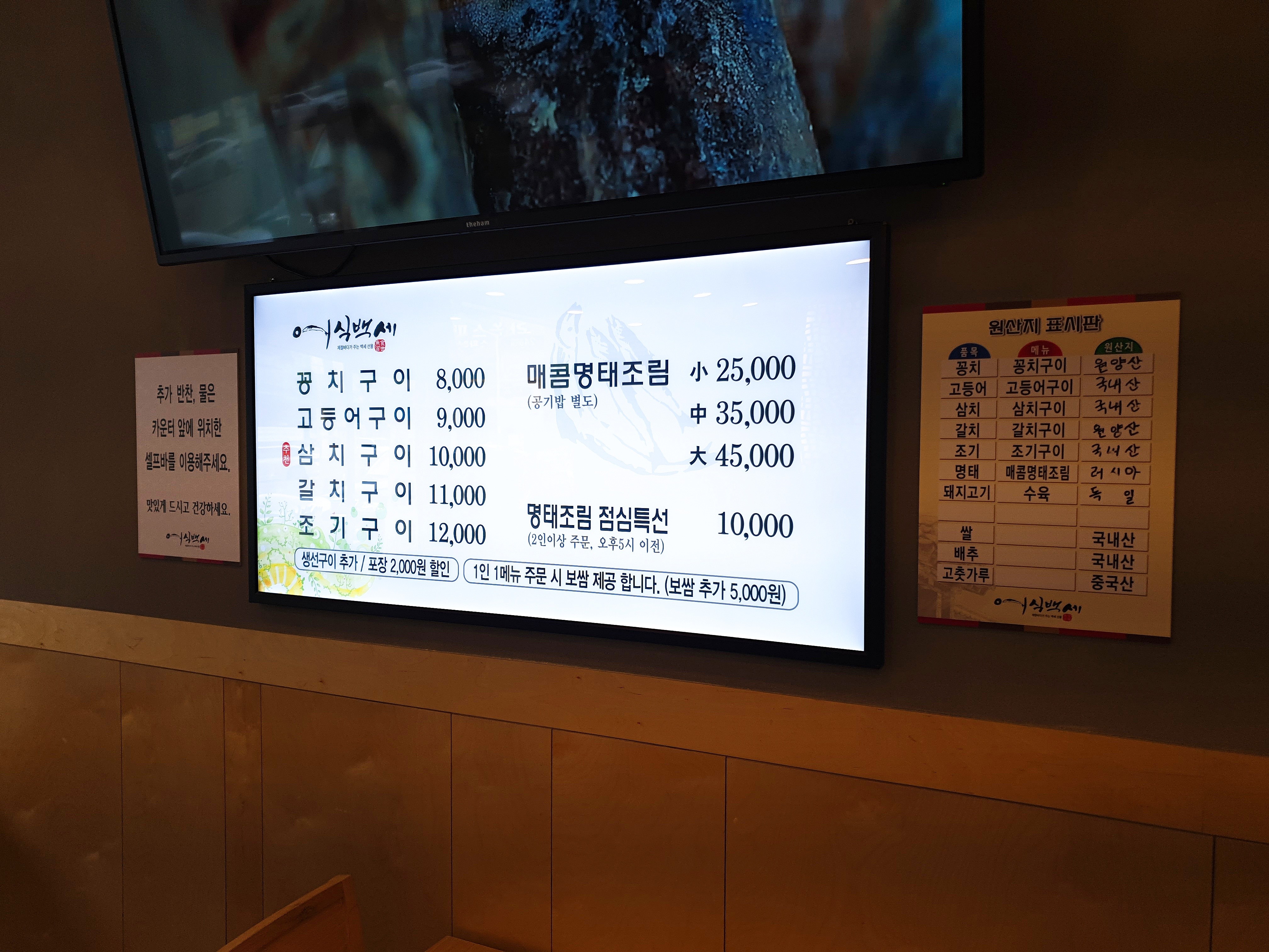딱 심플하게 구이메뉴와 명태조림으로 나뉘어져 있고, 생선은 꽁치, 고등어, 삼치, 갈치, 조기 중 고르실 수 있습니다.