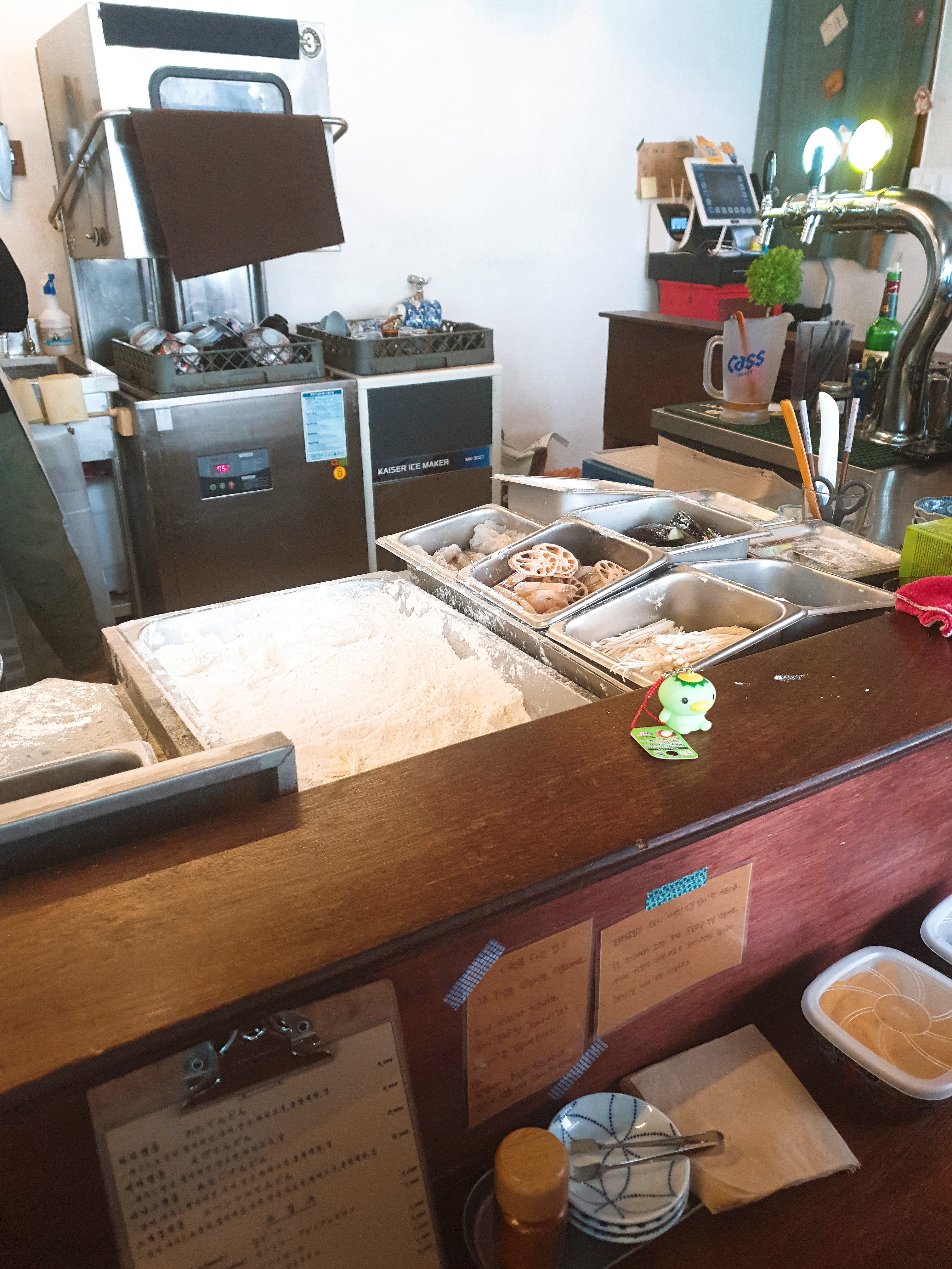 이렇게 가게에 들어가면 주방이 가운데에 훤히보이고 주방을 둘러서 테이블이 있어서 제가 시킨 메뉴를 튀기는 사장님의 튀김기술을 볼 수 있는 재미가 있는 가게입니다.