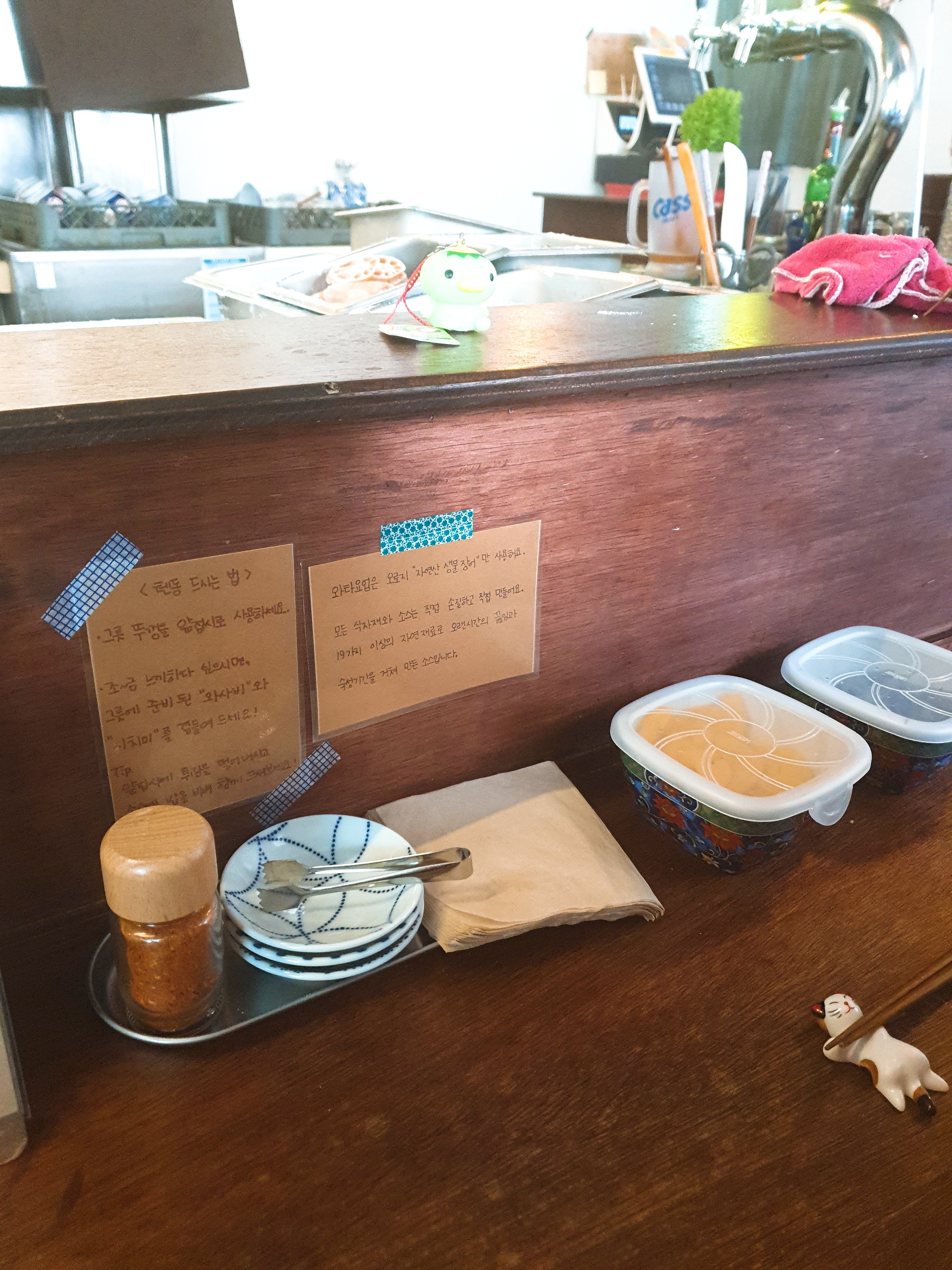 그리고 조금 느끼하면 생 와사비를 곁들여 먹으라는 친절한 안내문도 붙어있었습니다.