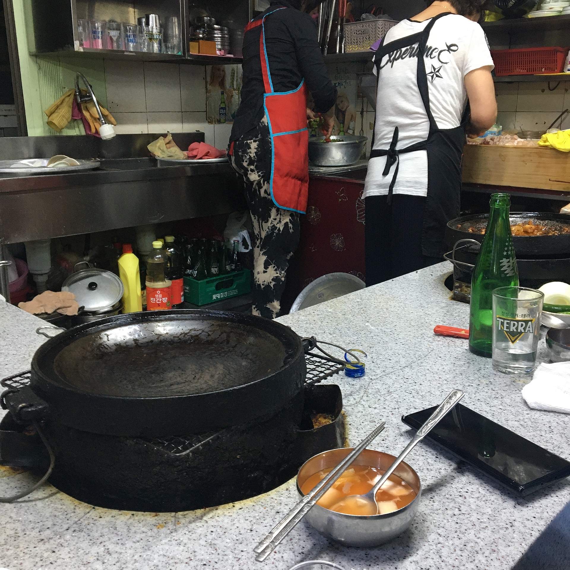 이렇게 바로 앞에 주방.. 이라고 해야겠죠? 주방이 있고, 앞엔 단촐한 상과 무쇠판이 저희를 기다리고 있었습니다.