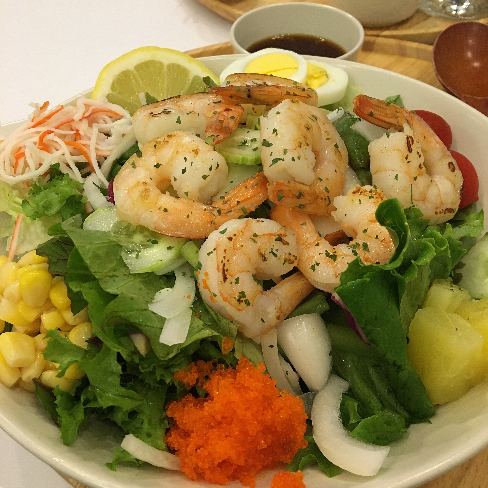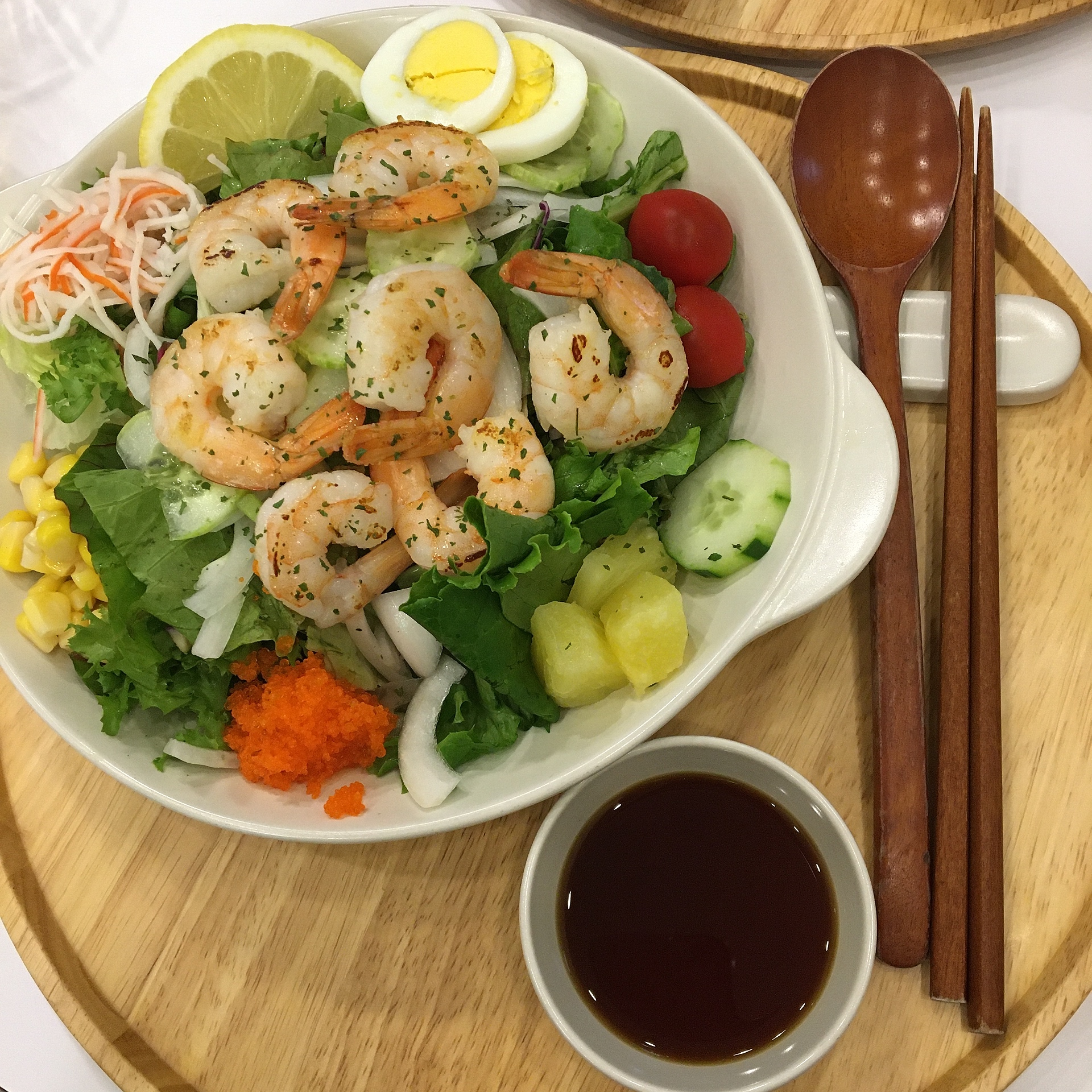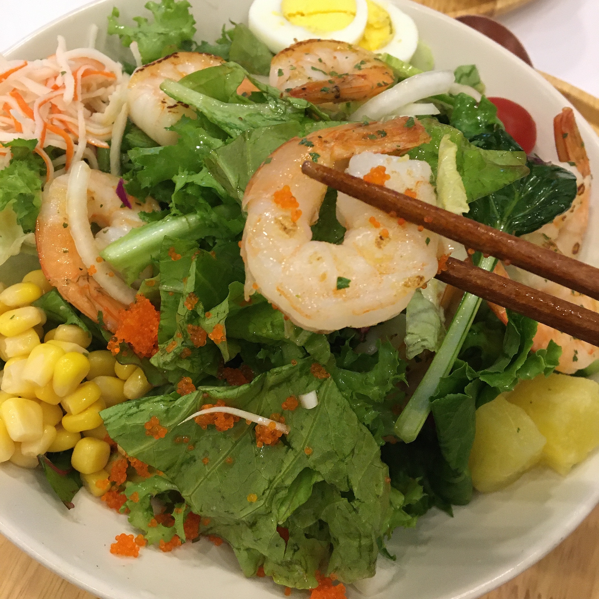 일단 제 그릇엔 기본적으로 새우, 게맛살, 파인애플, 각종 야채들, 날치알, 옥수수, 양파, 삶은달걀, 방울토마토.. 등 딱 봐도 건강해질 것 같은 재료들이 담겨있었습니다.