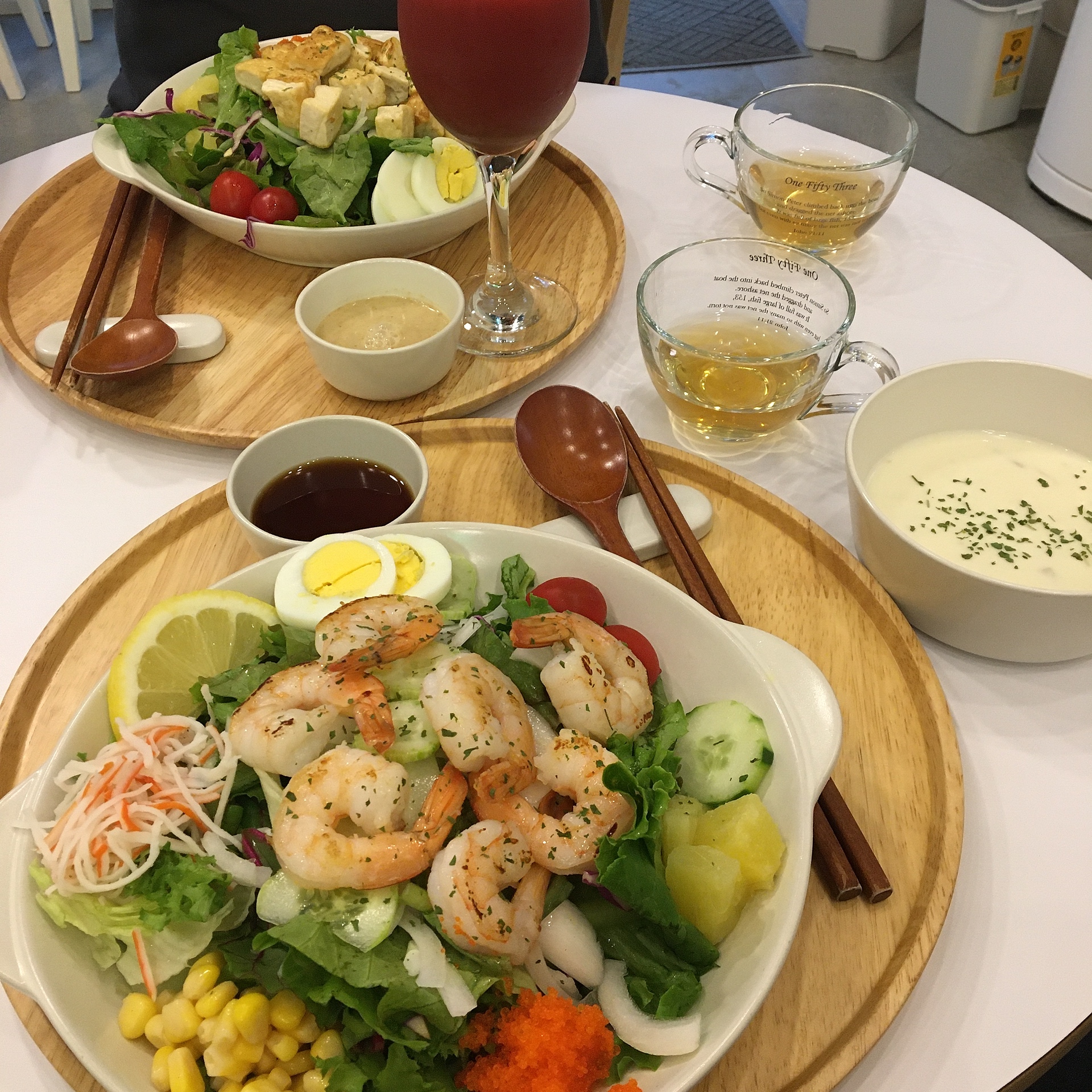 저쪽에 있는 메뉴는 참깨 두부포케에 샐러드, 그리고 착즙주스를 시킨 모습입니다.