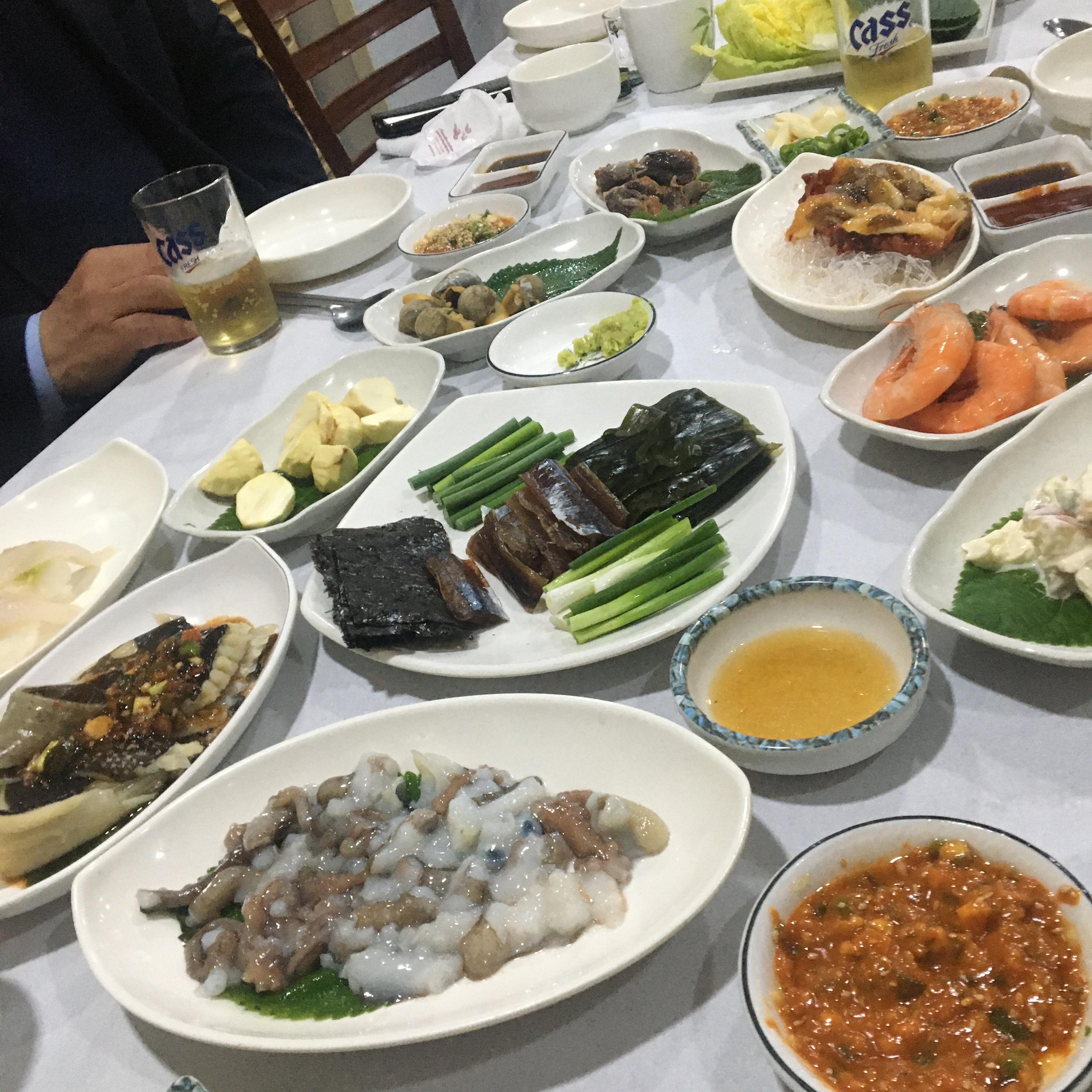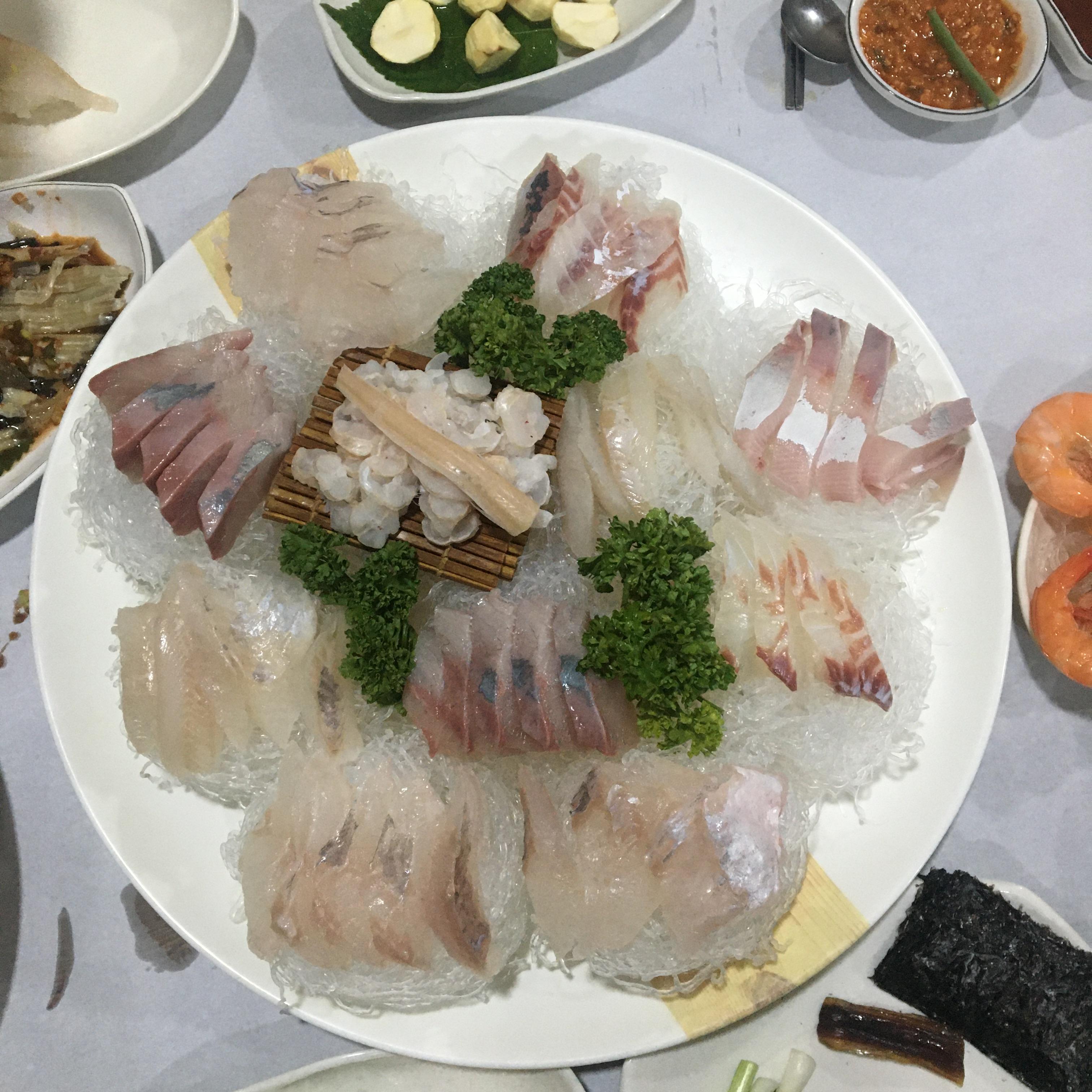 낙지탕탕이, 홍어찜, 과메기, 새우, 초밥, 멍게 등등..