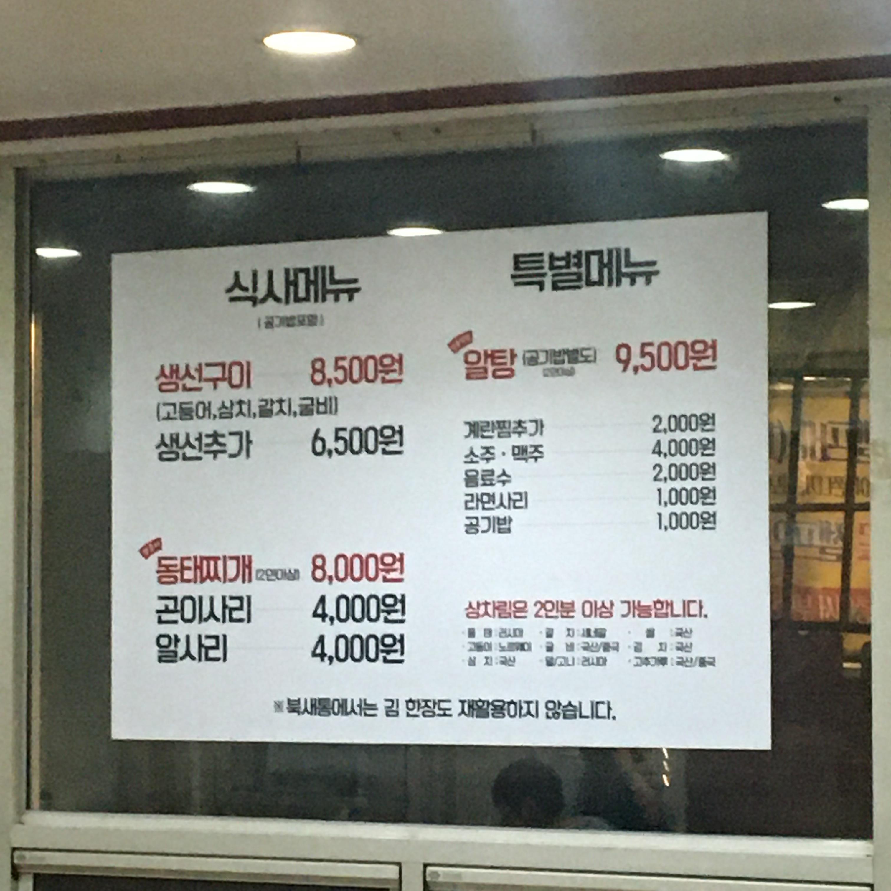 알탕이 기본 메뉴이고 생선구이, 동태찌개가 있습니다.