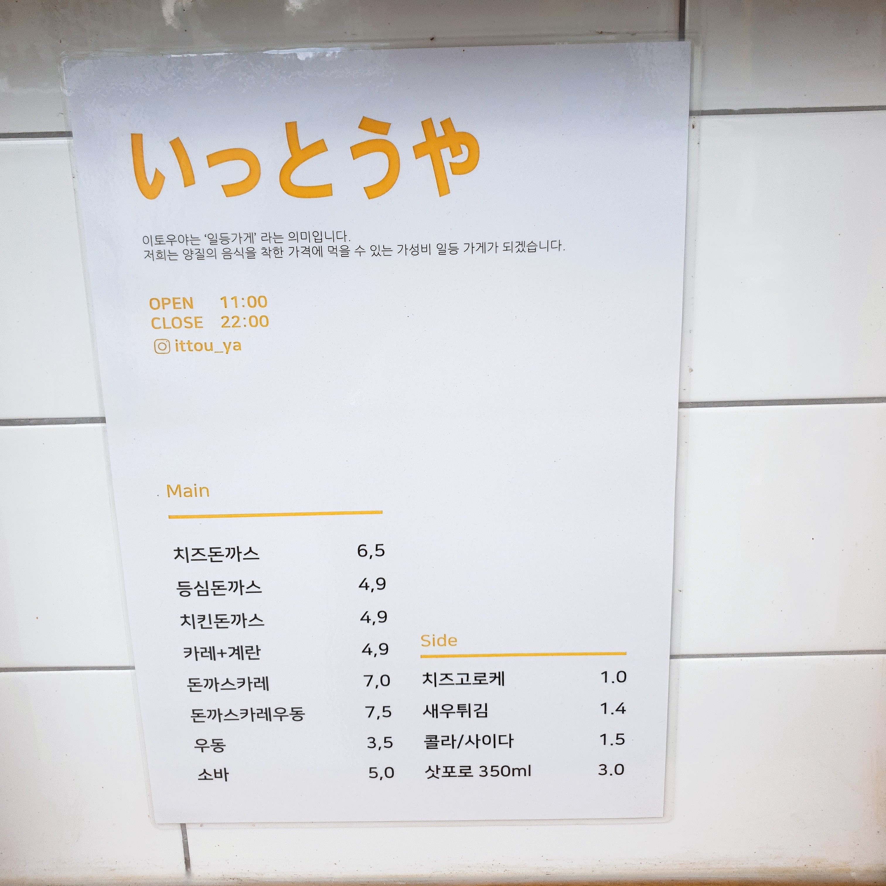 이토우야 메뉴는 치즈돈까스, 등심돈까스, 카레 등 일반 돈까스집에서 보시는 그런 메뉴인데, 가격이 상당히 쌉니다. 가성비 맛집이 되겠습니다.