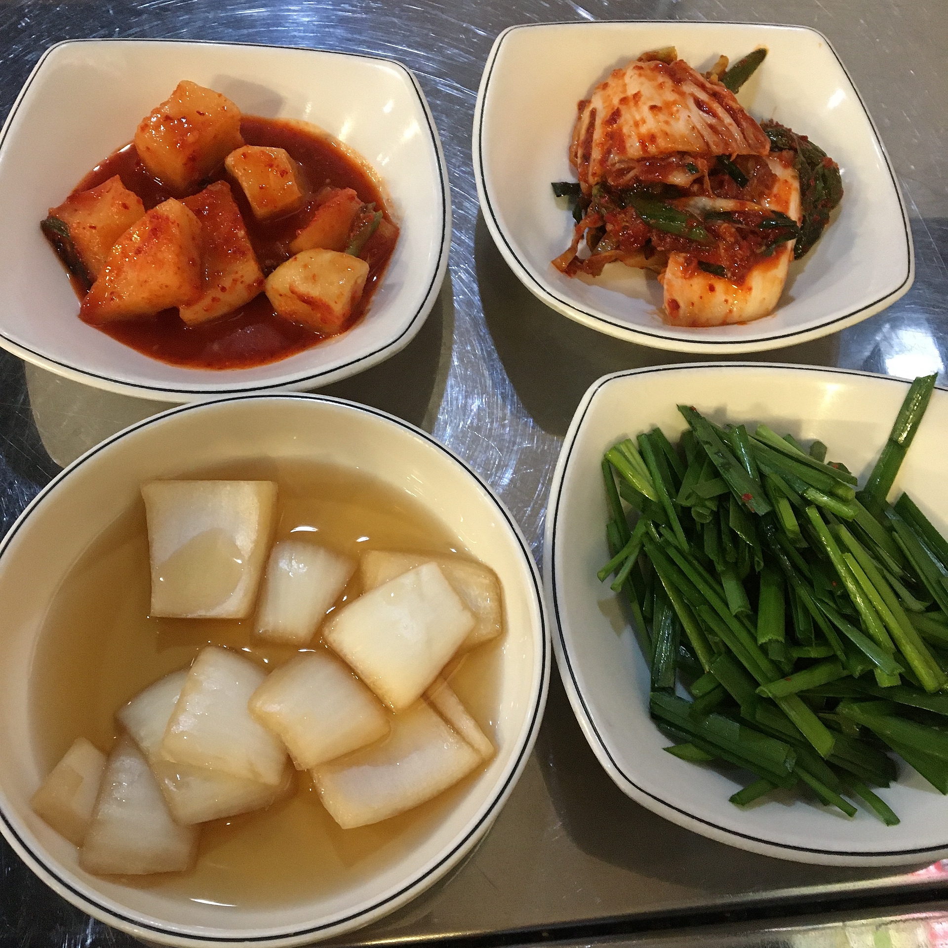 기본 밑반찬으로 깍두기, 배추김치, 양파절임, 부추를 주십니다.