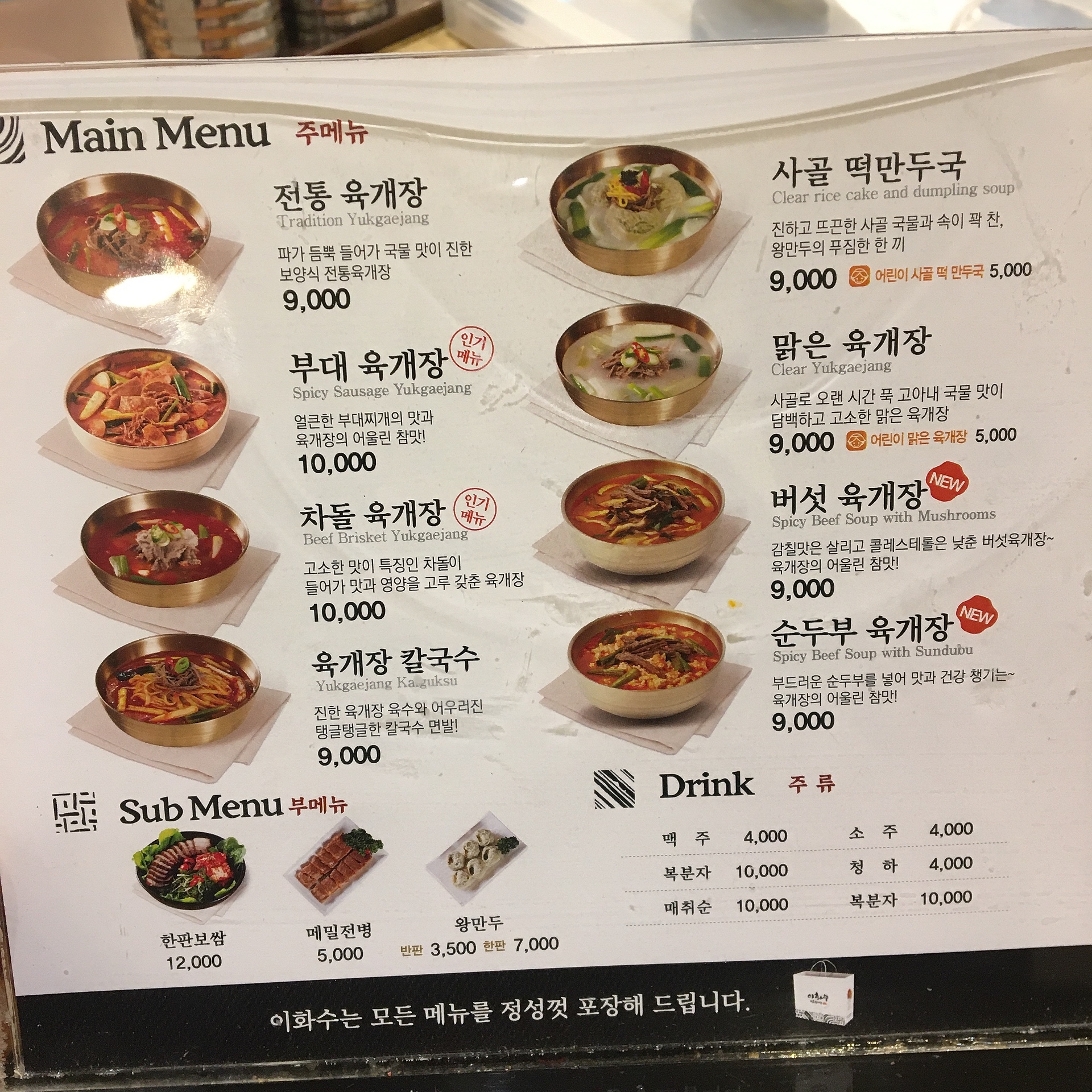 육개장 종류가 정말 많더라구요. 부대, 차돌, 버섯, 순두부육개장. 거기에 맑은육개장과 사골떡만두국까지.