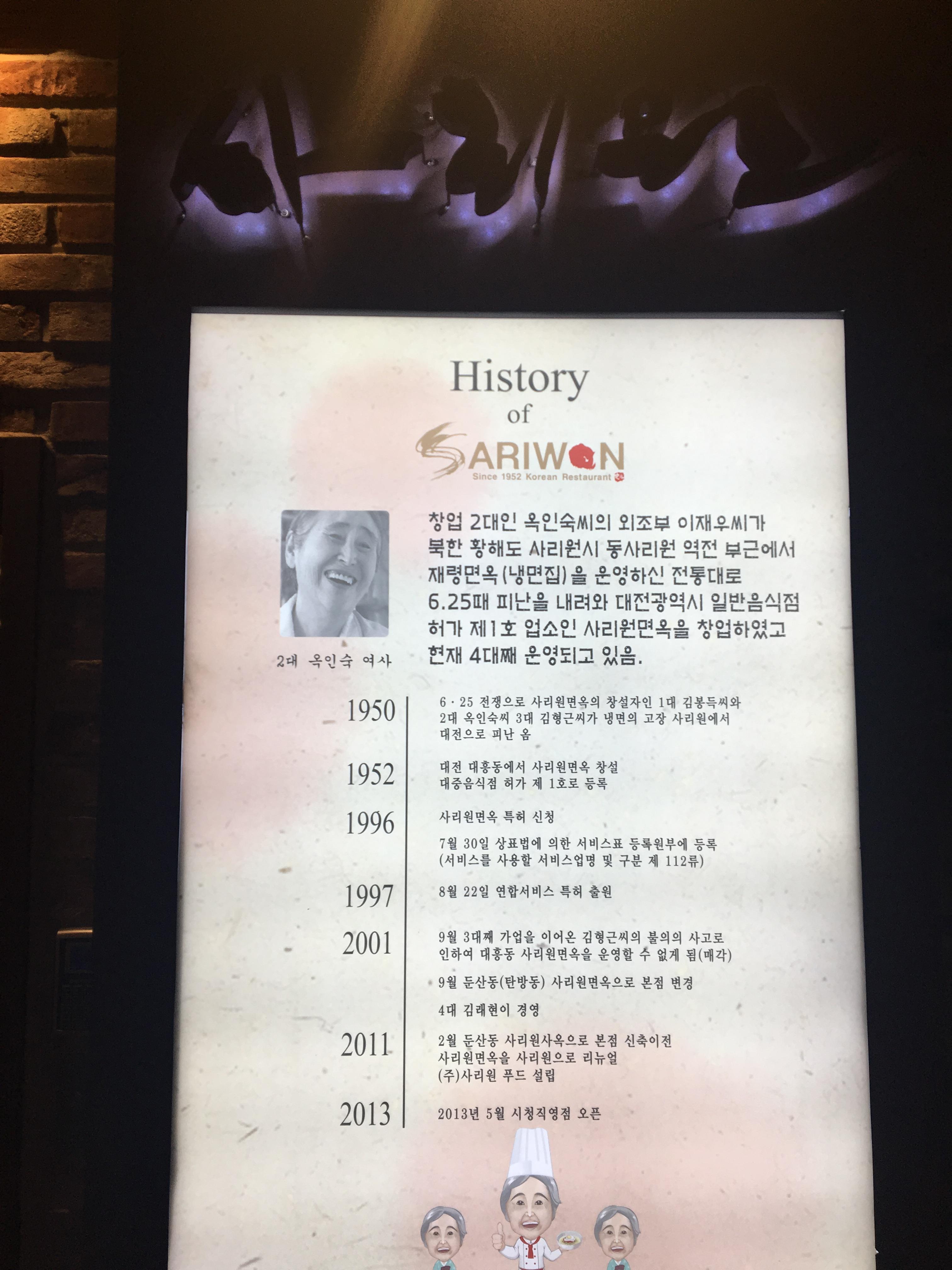 1950년에 625로 인해 사리원에서 대전으로 피난온 후 52년도에 대흥동에서 사리원면옥을 창설했는데, 대중음식점 허가 제1호였다고 합니다.