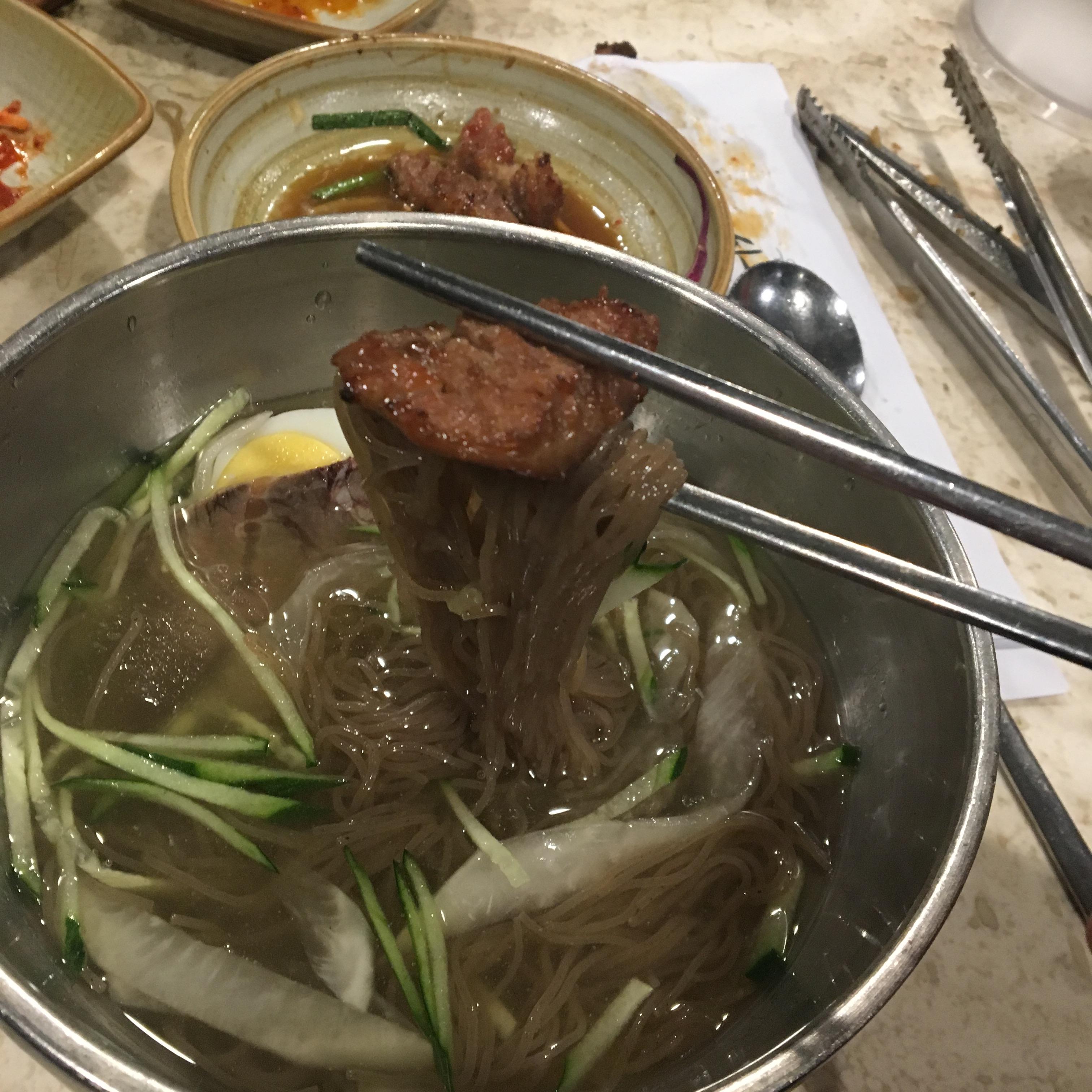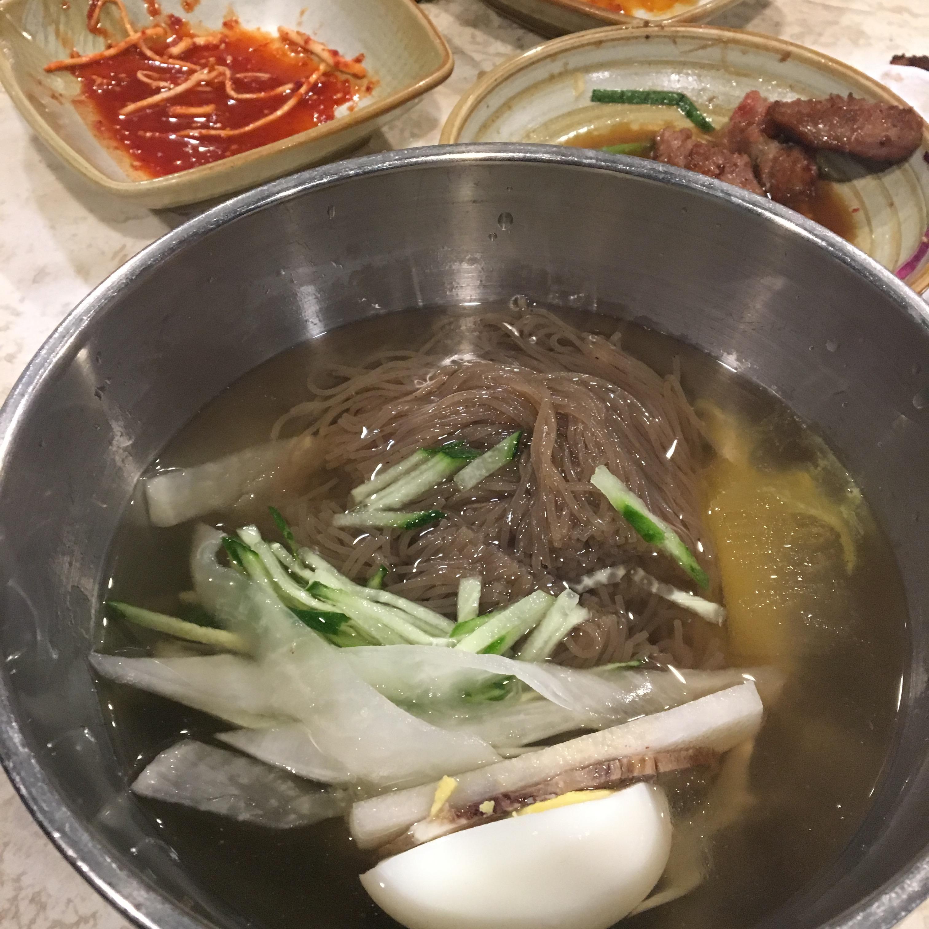 맑은 국물이 특징이었고, 평소 고기집에서 먹던 그 시원하고 새콤한 맛의 냉면밖에 먹어보지 않던 저에겐 좀 생소한 맛이었습니다.
