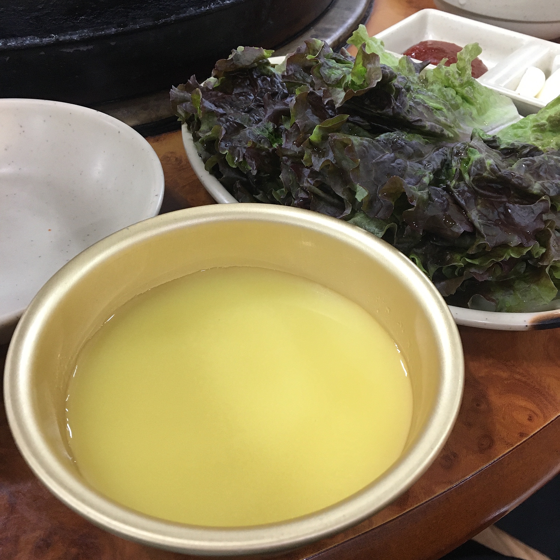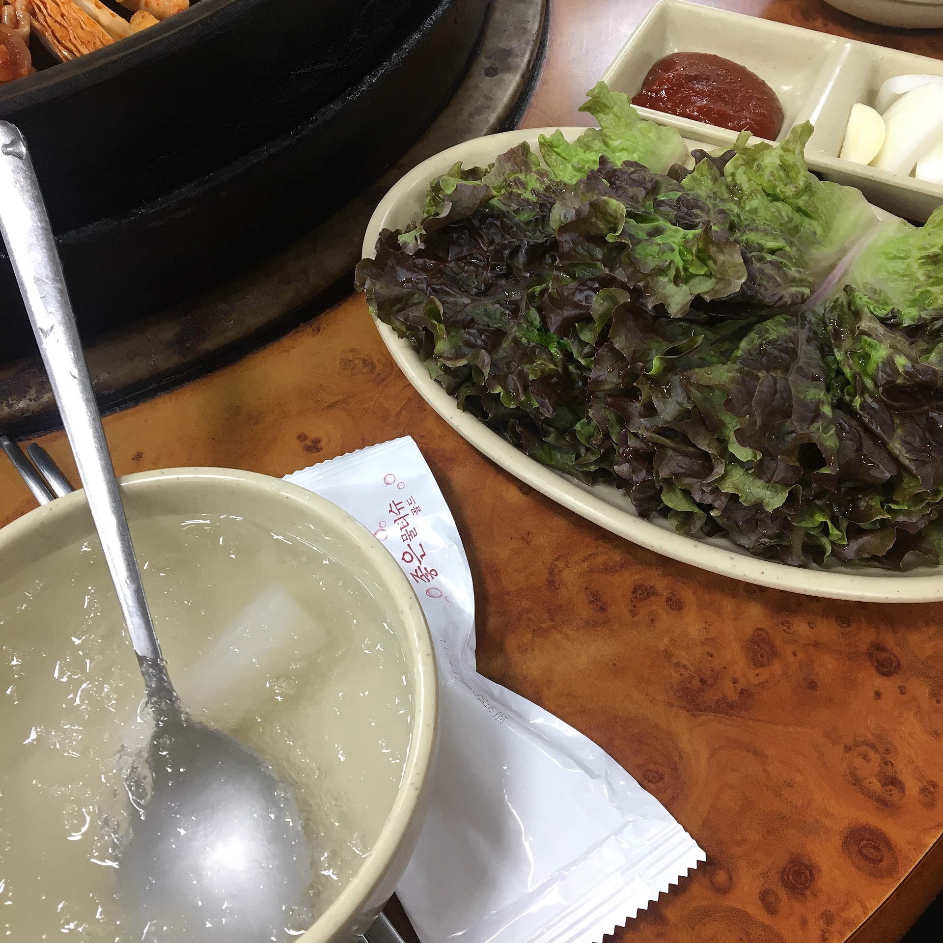 상추, 양파, 마늘, 고추장, 그리고 물김치.