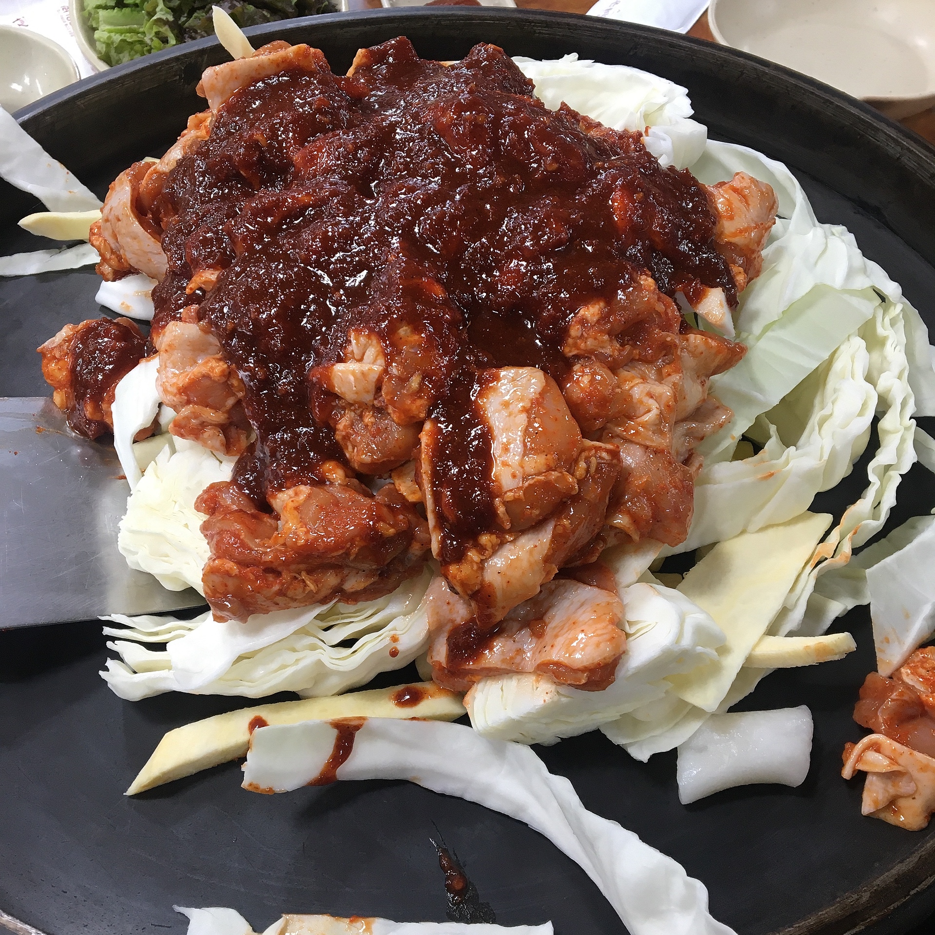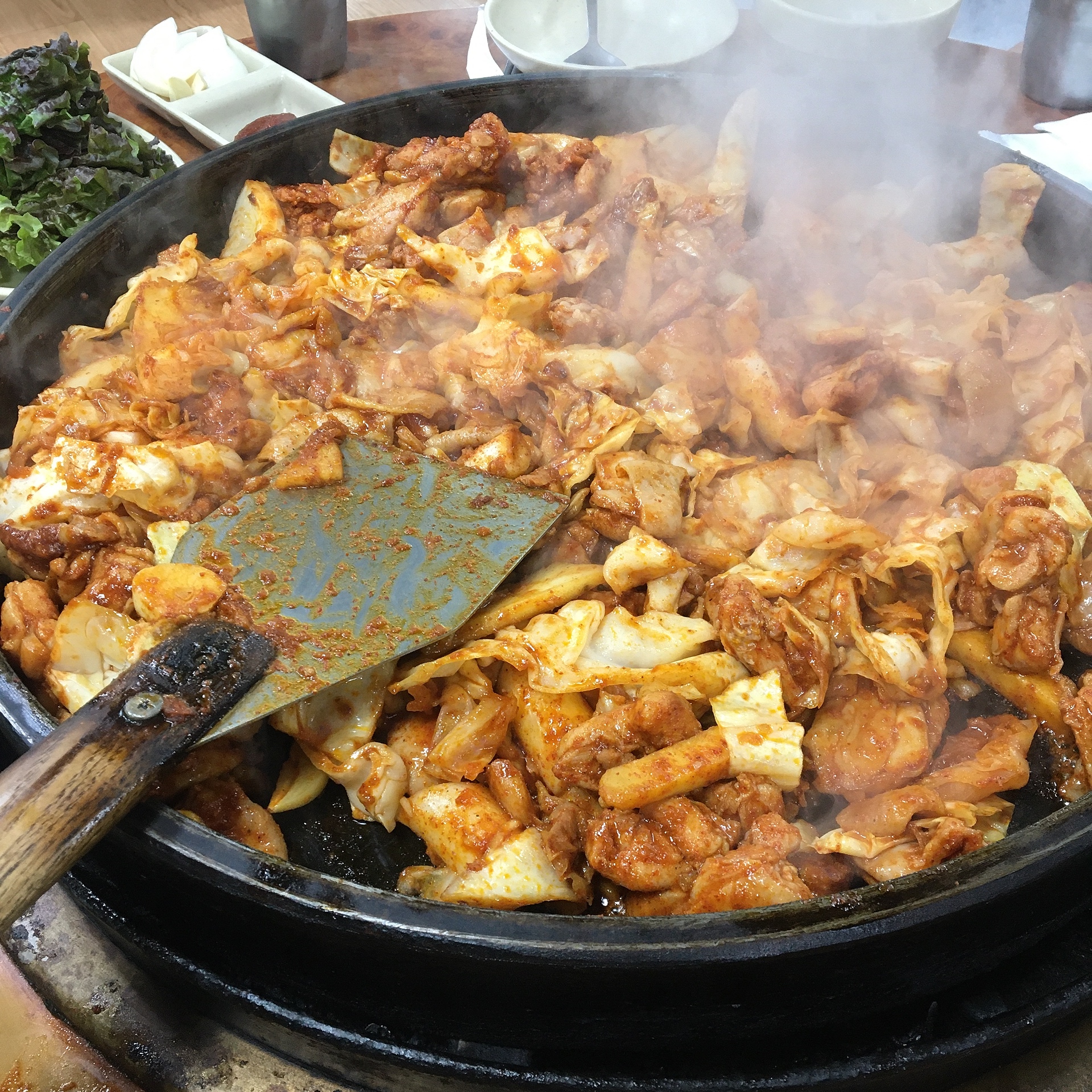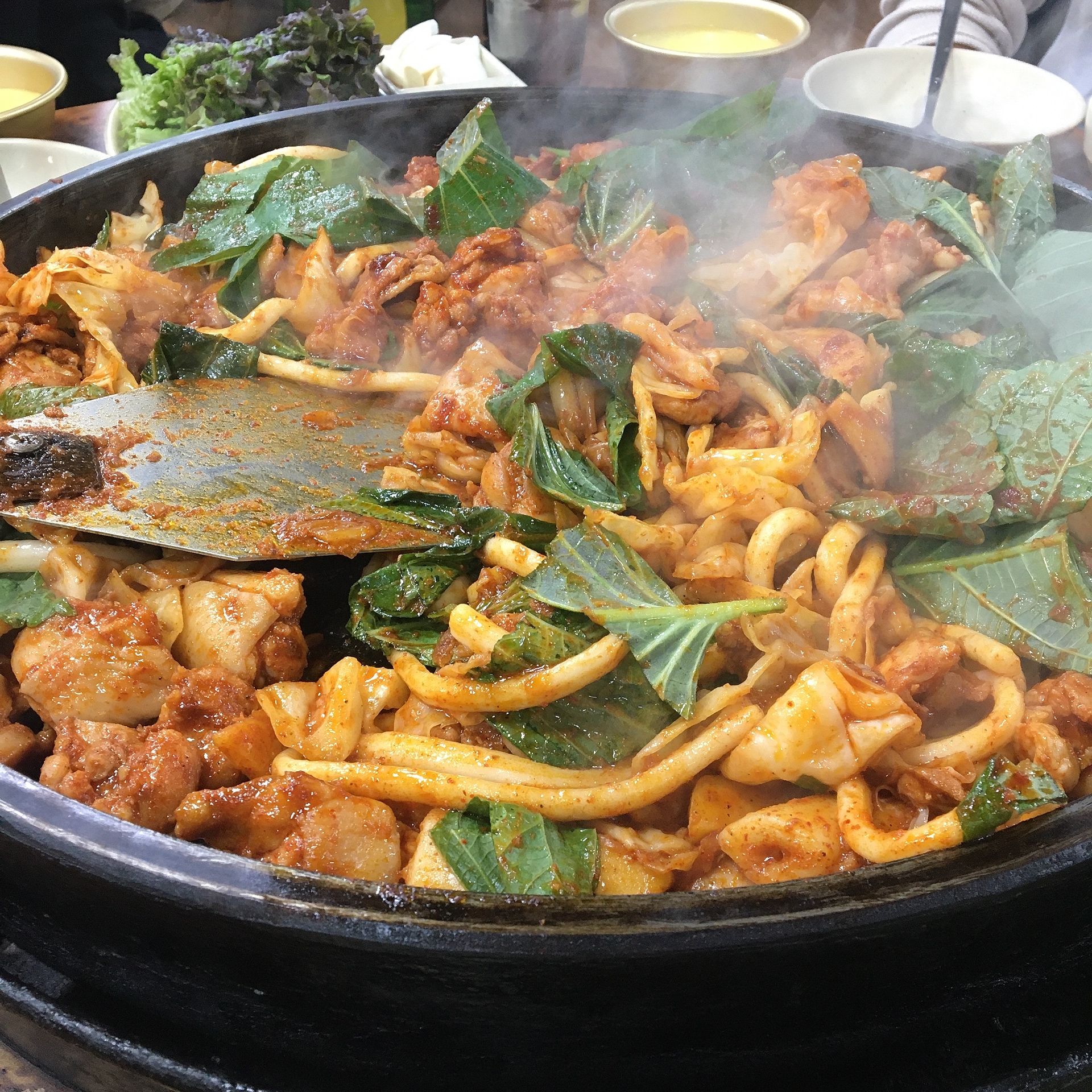 처음엔 닭갈비만 넣고 익히시다가 추후에 깻잎과 우동사리를 같이 넣어주셨습니다.