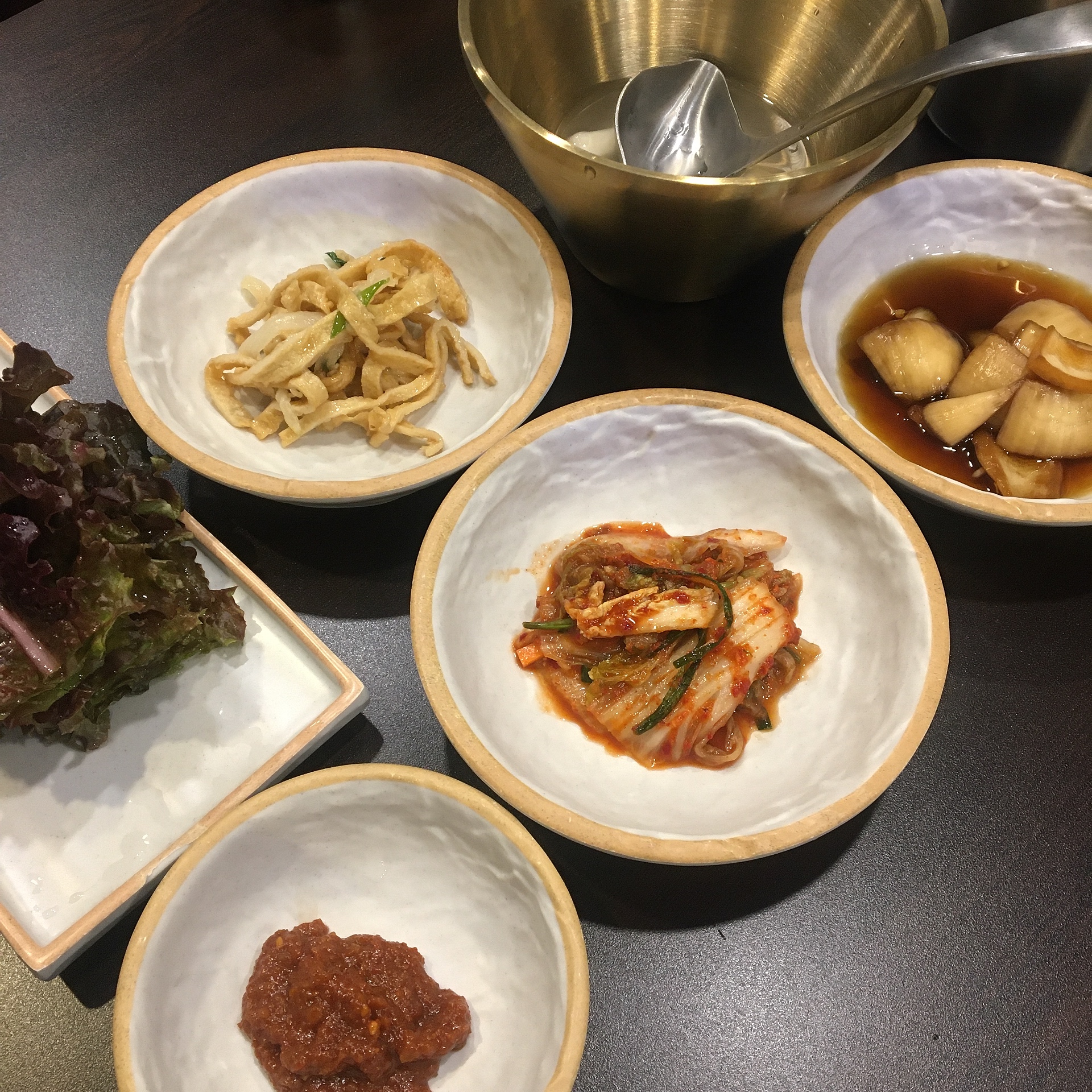 상추, 쌈장, 어묵볶음, 배추김치, 양파절임, 동치미까지.