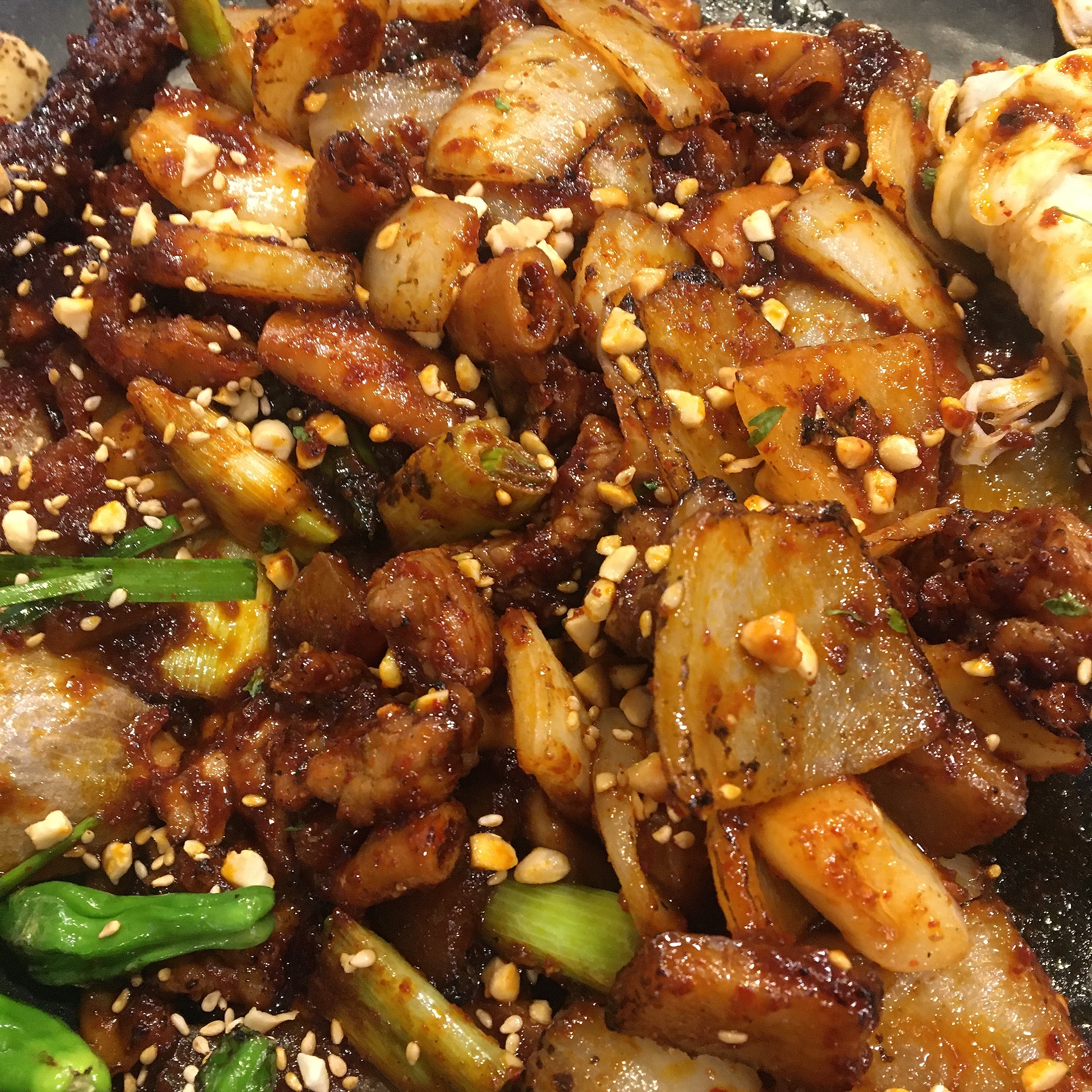 치즈를 드러내니까 이렇게 안에 맛있는 곱창, 갈비, 껍데기, 양파들이 잔뜩 들어있었습니다.
