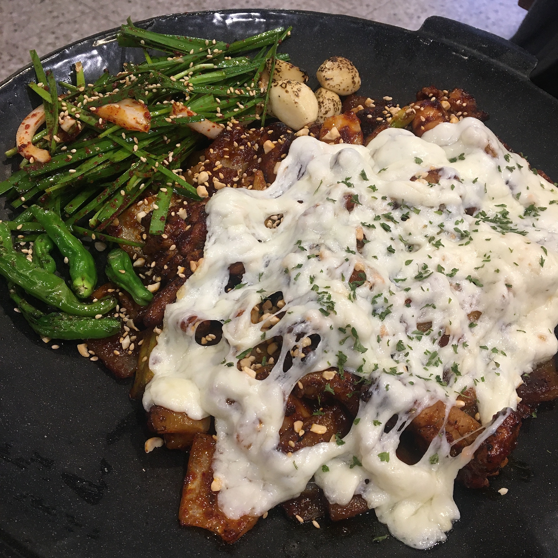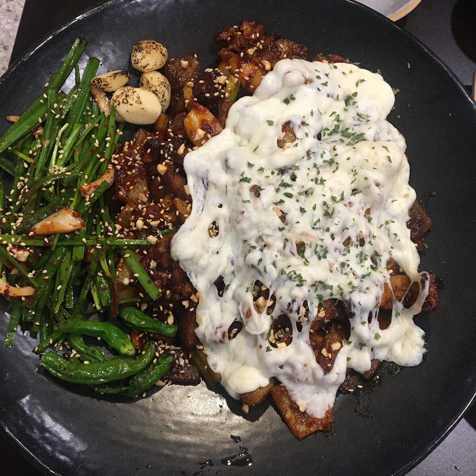 구이와 꽈리고추와 부추무침과 불에그을린 통마늘에 하얀 치즈라니..
