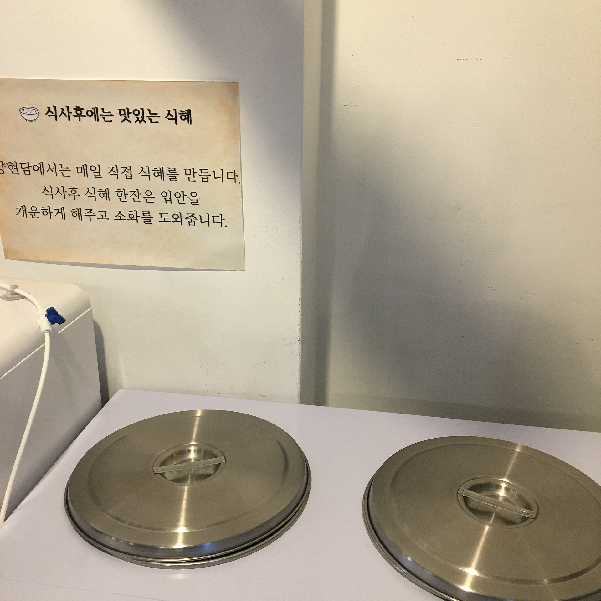 이렇게 냉장고도 준비되어 있는데, 왼쪽엔 식혜가 담겨있고 오른쪽엔 동치미가 담겨져 있습니다.