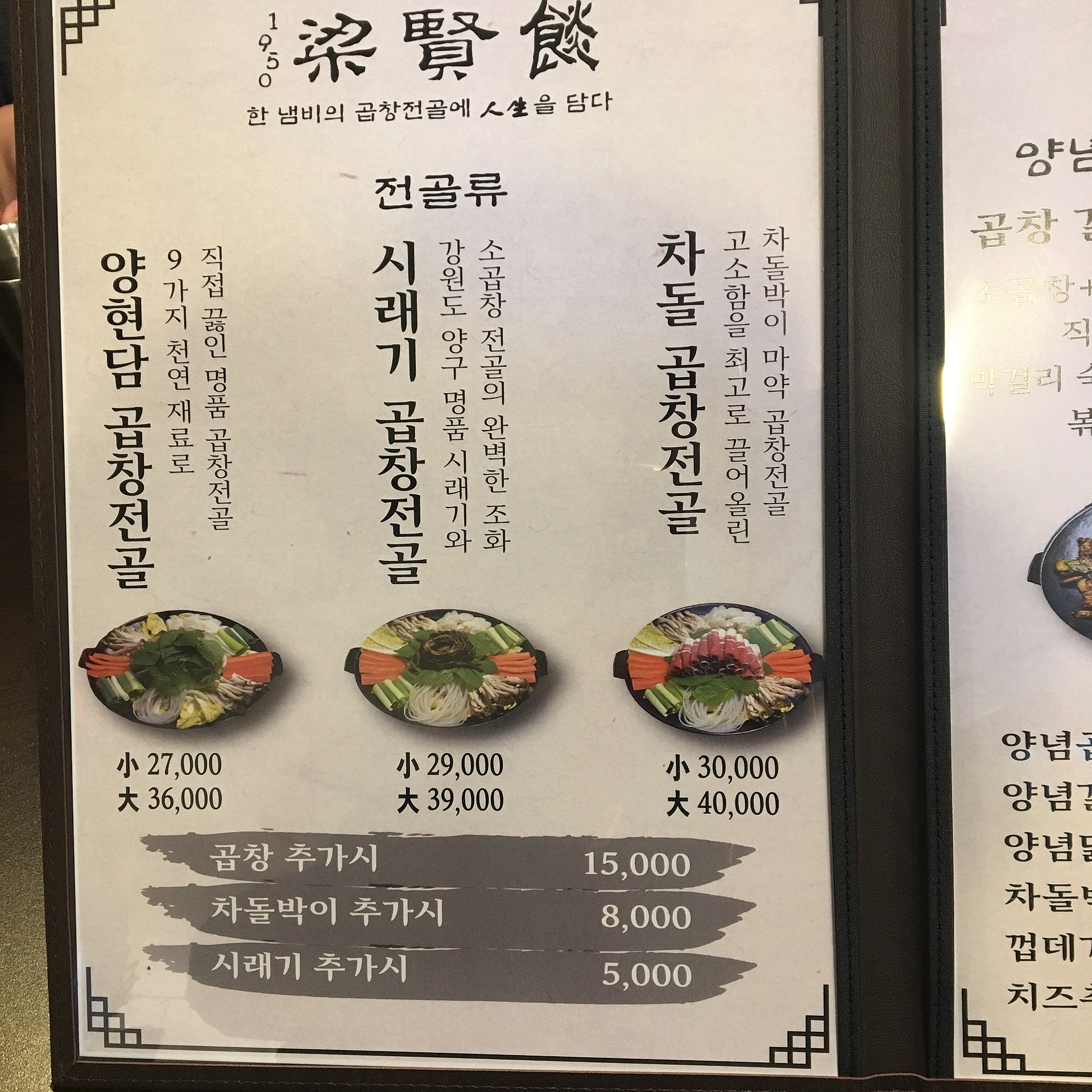 이곳에선 곱창을 전골과 구이로 즐기실 수 있는데, 전골은 기본 양현담곱창전골과 시래기전골, 차돌전골로 나눠집니다.
