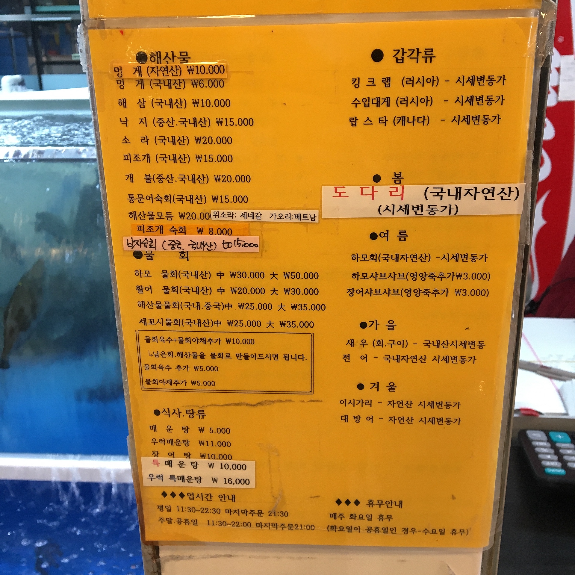 들어가시면 당황하지 마시고 벽면에 붙어있는 메뉴판과 팔딱팔딱 뛰는 해산물들을 보시고 마음속으로 메뉴를 정하시고, 카운터에서 주문을 하신 후 2층으로 올라가시면 됩니다.