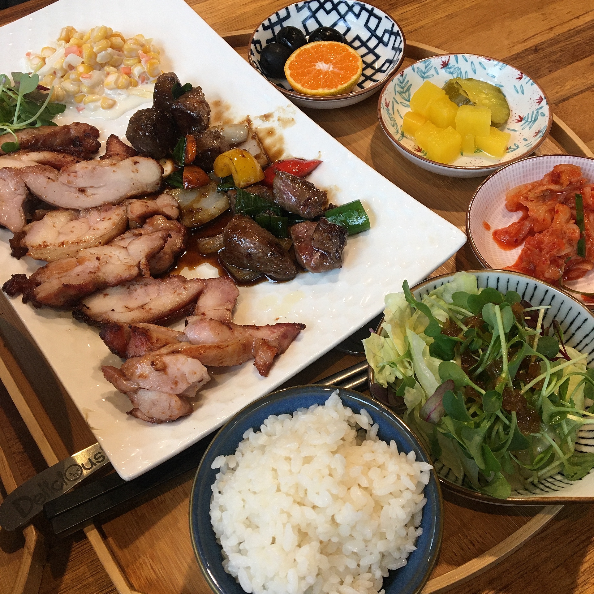 닭다리살 스테이크와 찹스테이크가 반반 정도 들어있고, 돈코츠라멘 밑반찬에 샐러드가 추가된 구성이었습니다.