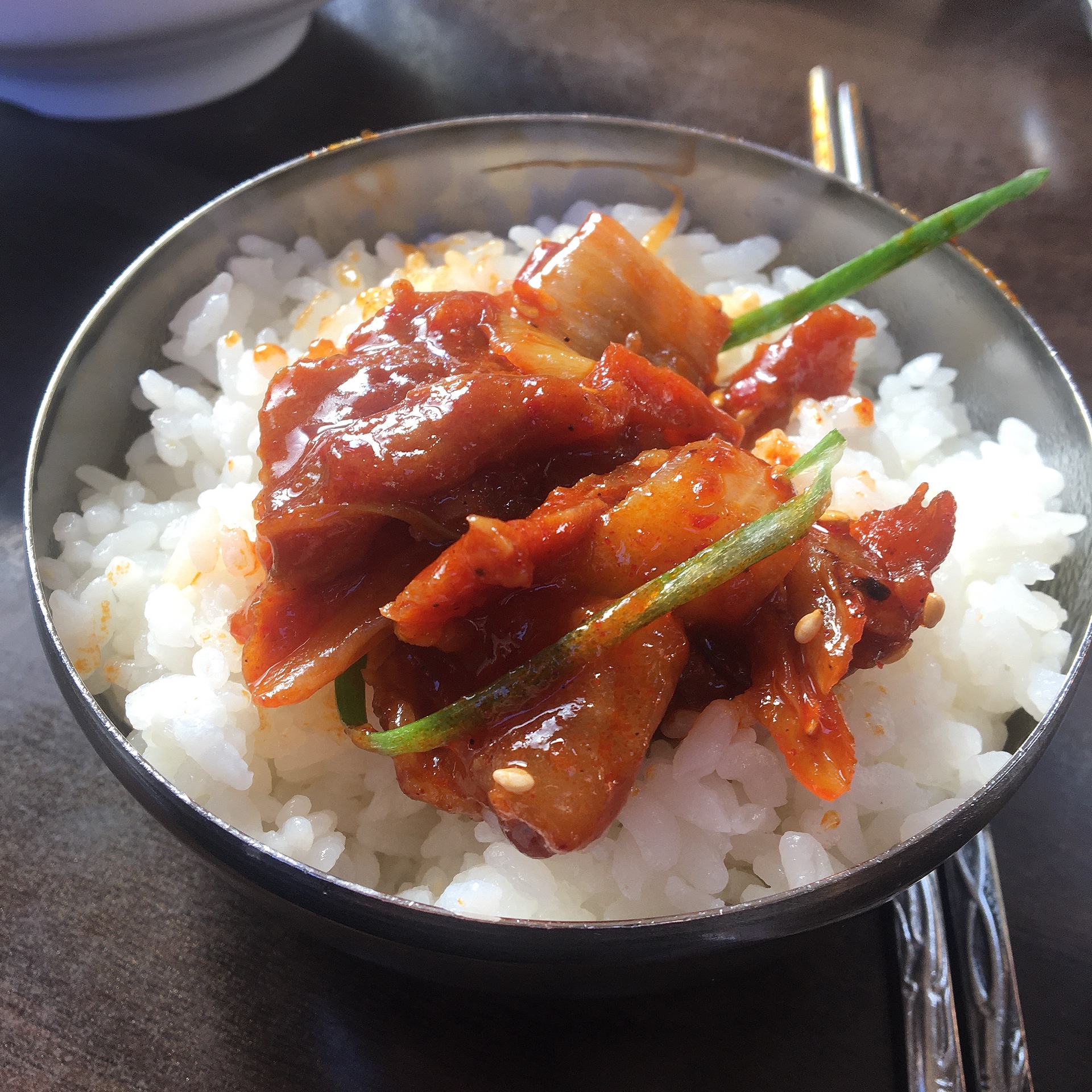 저는 저 마늘장아찌가 새콤한게 살짝 강할 수 있는 콩나물국밥과 두루치기의 맛을 중간중간 중화시켜줘서 같이 먹기 좋았습니다.