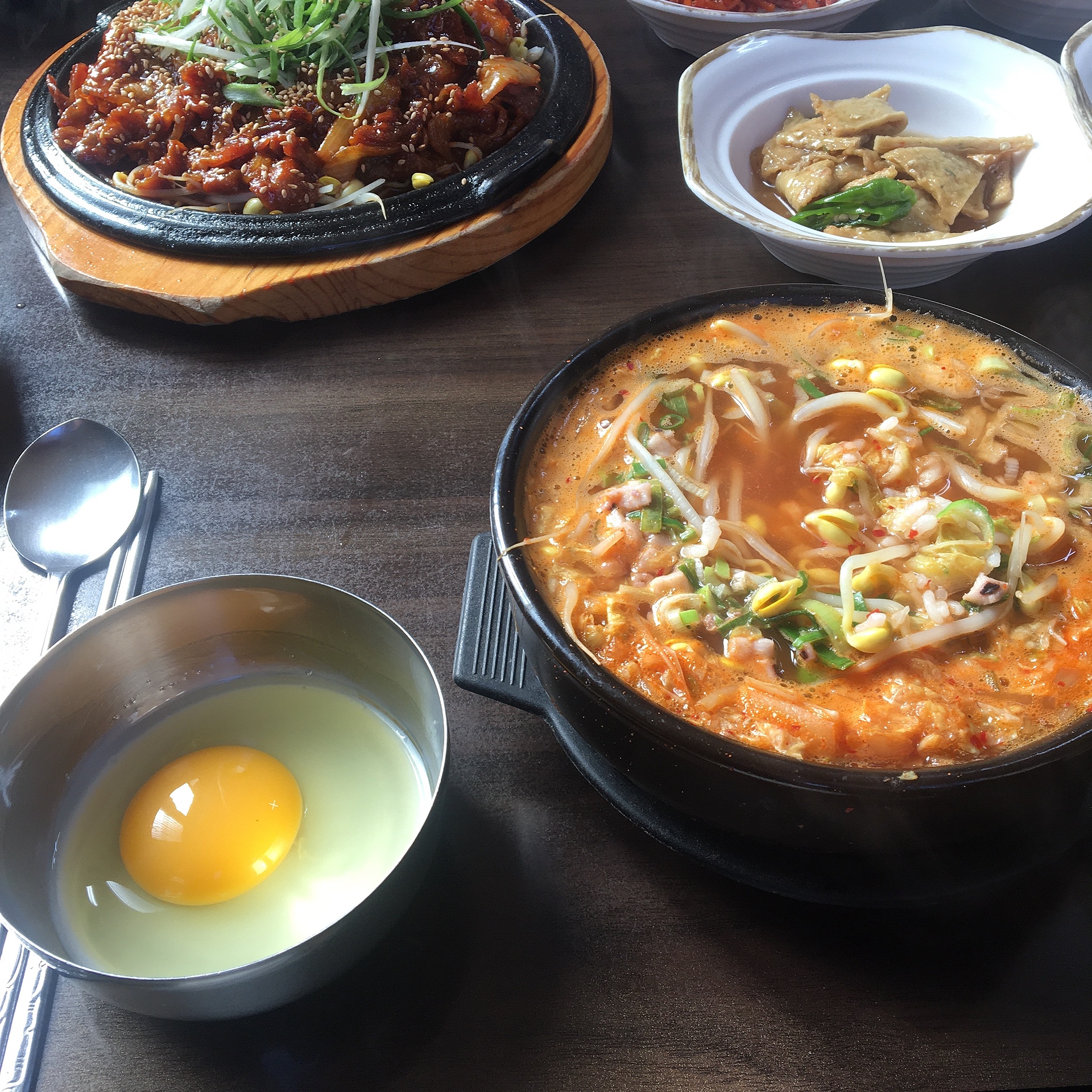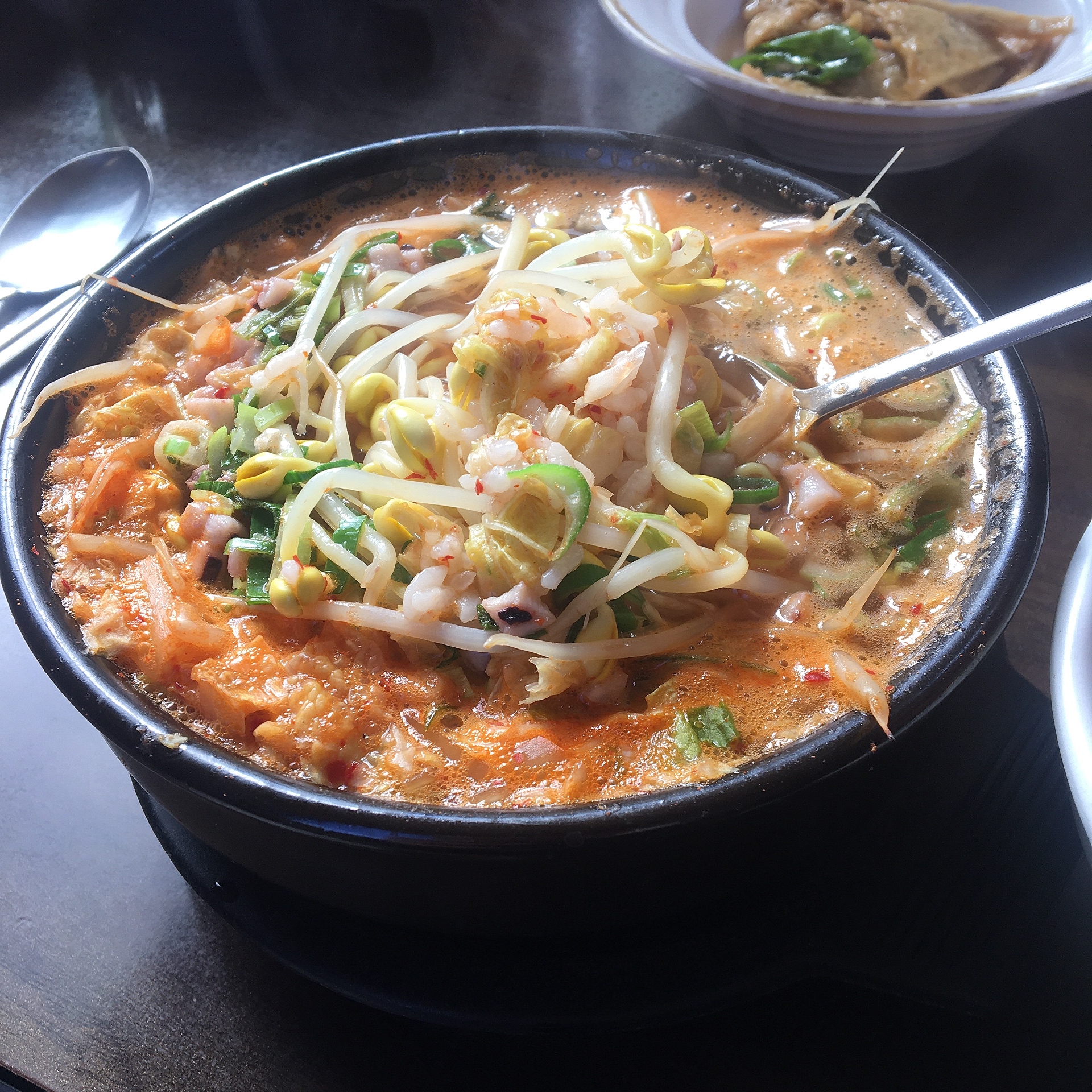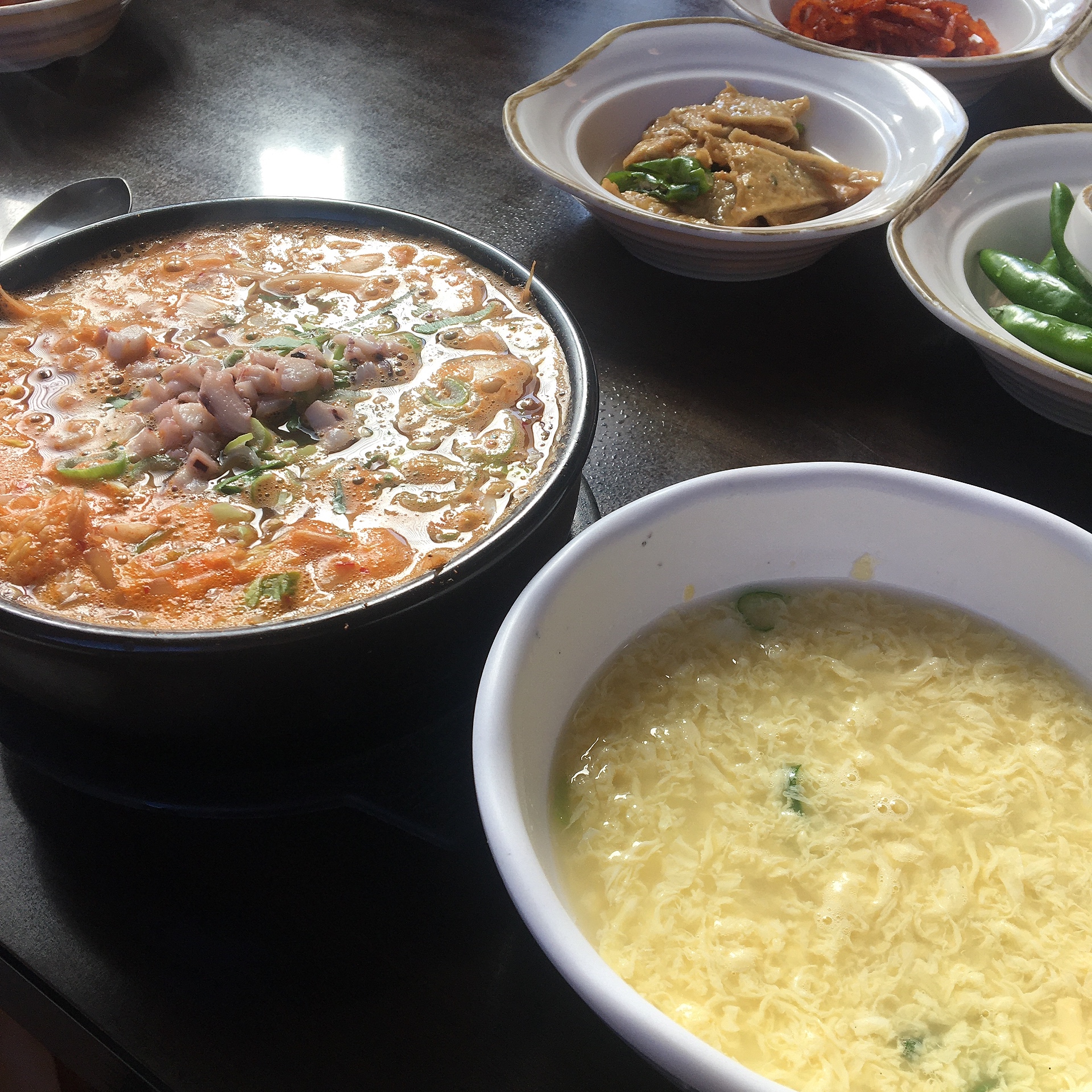 뚝배기에 바글바글 끓으면서 담겨있는게 너무 먹고싶게 생겼었습니다. 가운데에 오징어가 잘게 잘려 올려져있었고, 하얀국물은 아니었고 김치를 넣으신 것 같은 빨간 국물이 특징이었습니다.