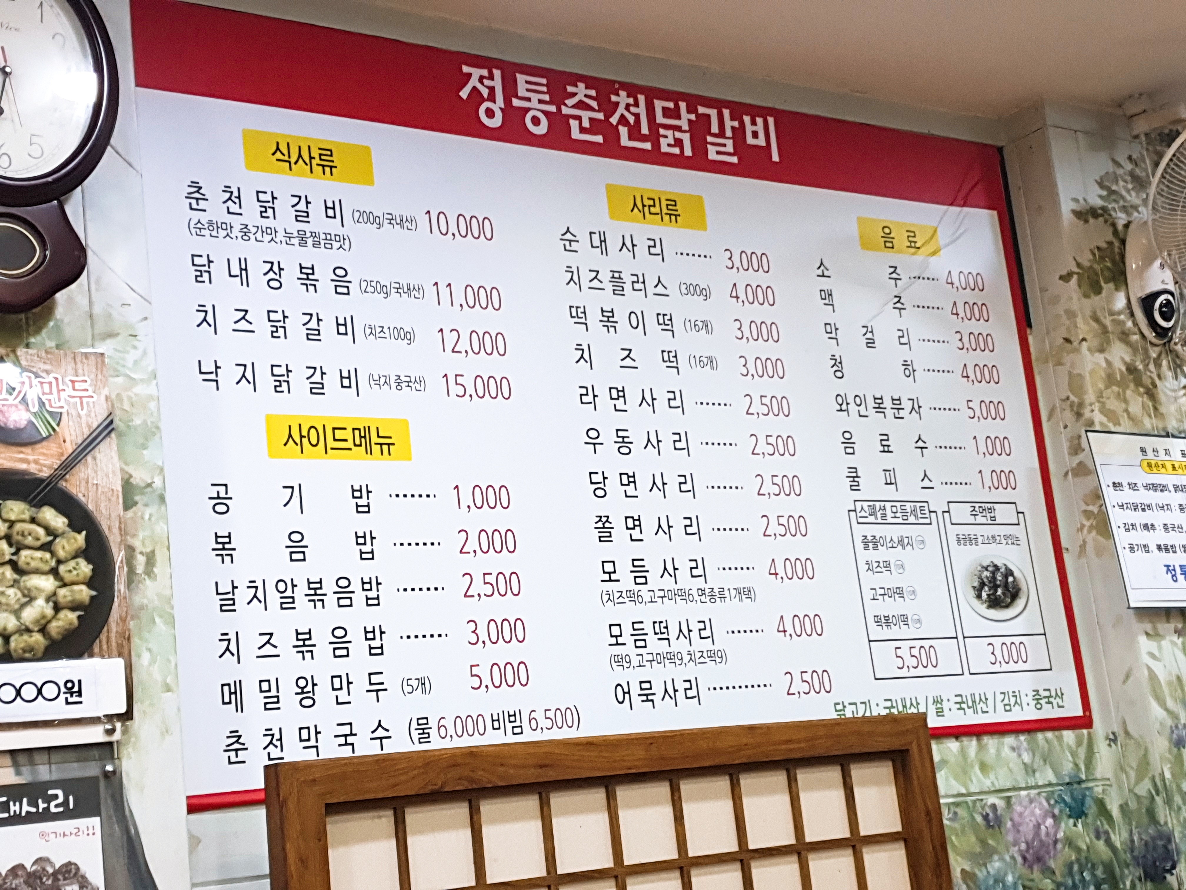 정통춘천닭갈비 메뉴입니다.
