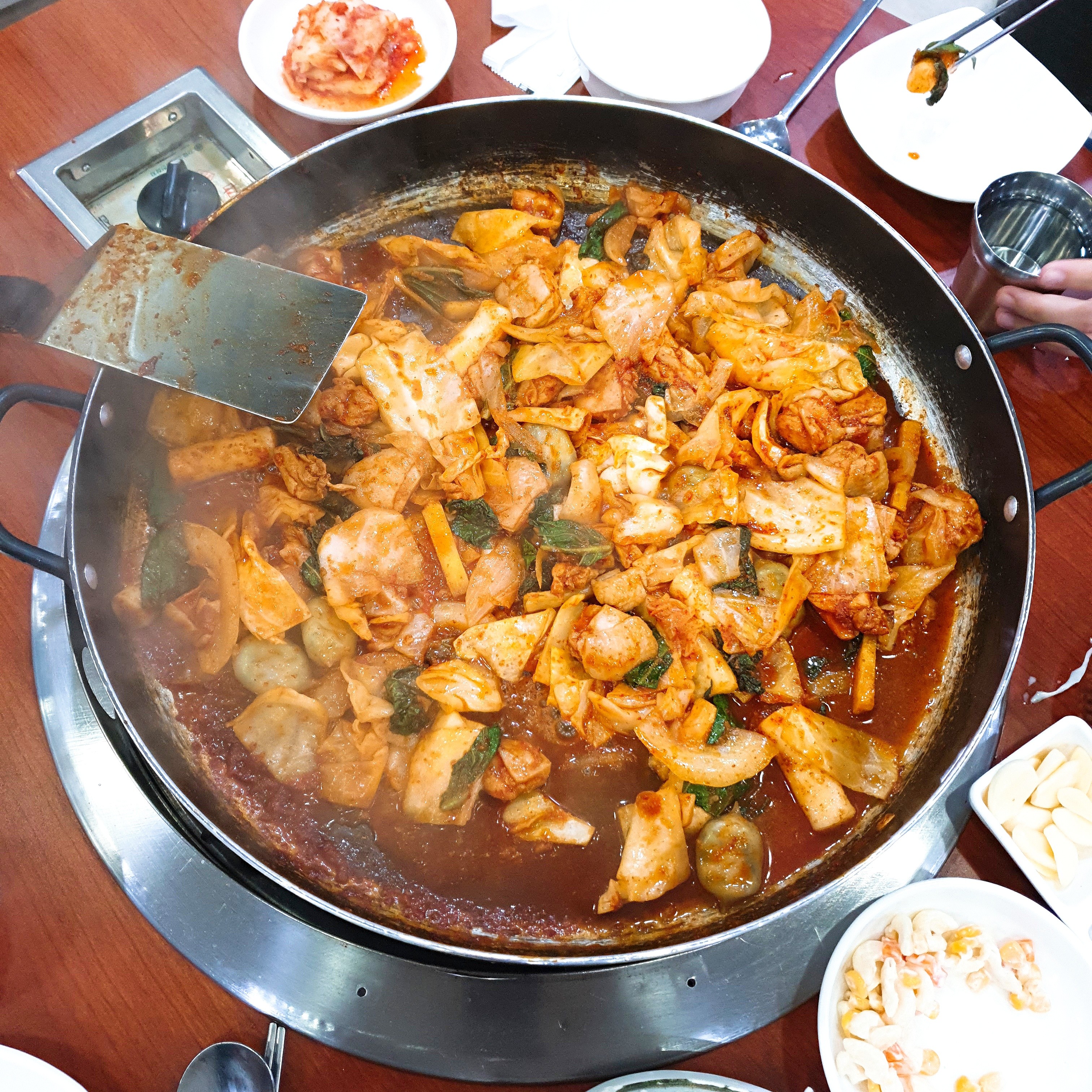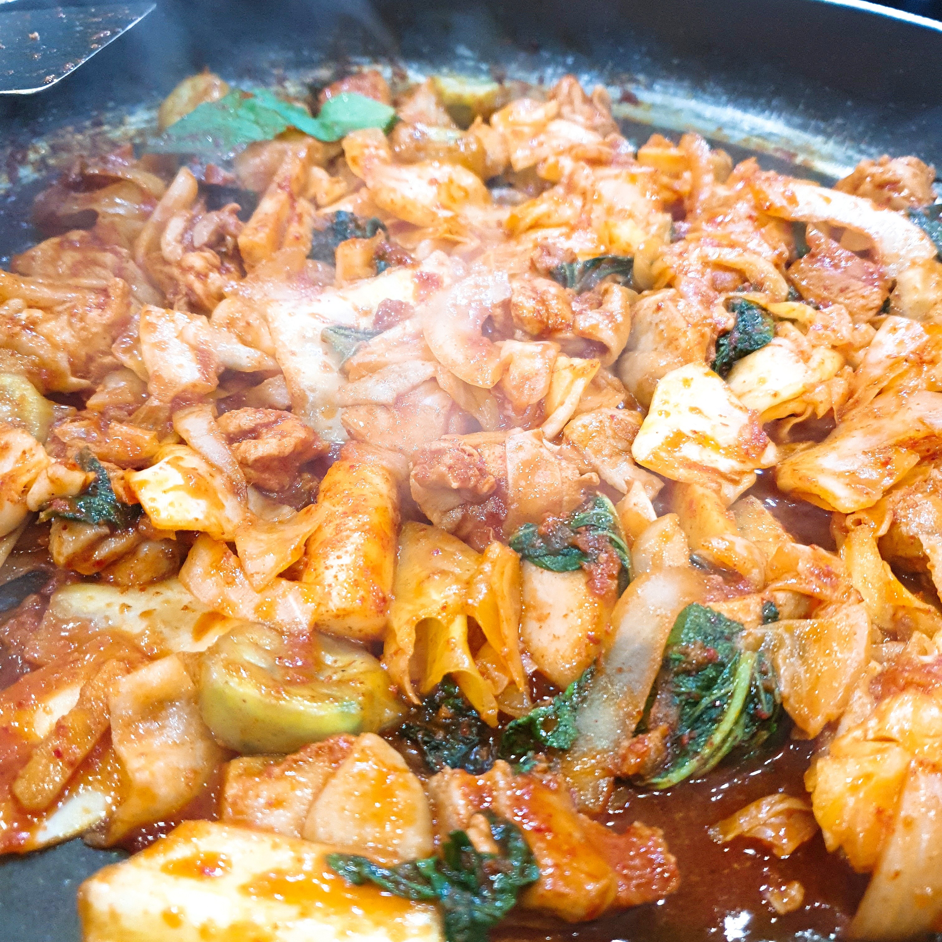 철판 위에서 닭갈비가 맛있게 익어가고 있습니다.