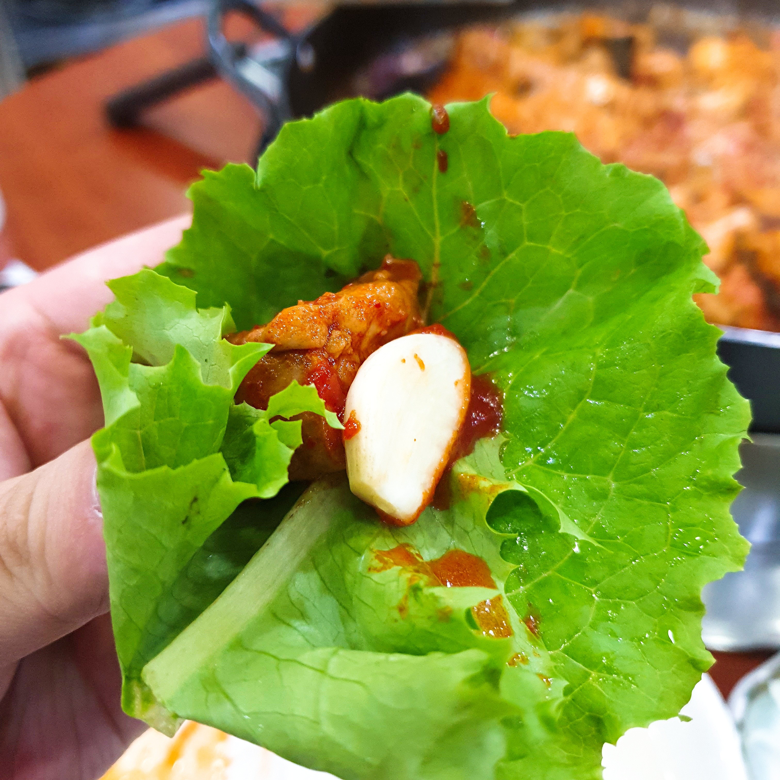 고추장이 물엿을 넣으셨는지 달콤한 맛이 났는데, 그런 고추장이 마늘의 매운맛을 중화시켜주면서 고추장과 닭갈비양념이 합쳐져 맛이 엄청 셀 것 같은걸 상추가 중화시켜주면서, 마지막엔 마늘의 알싸함이 입안에 남는.
