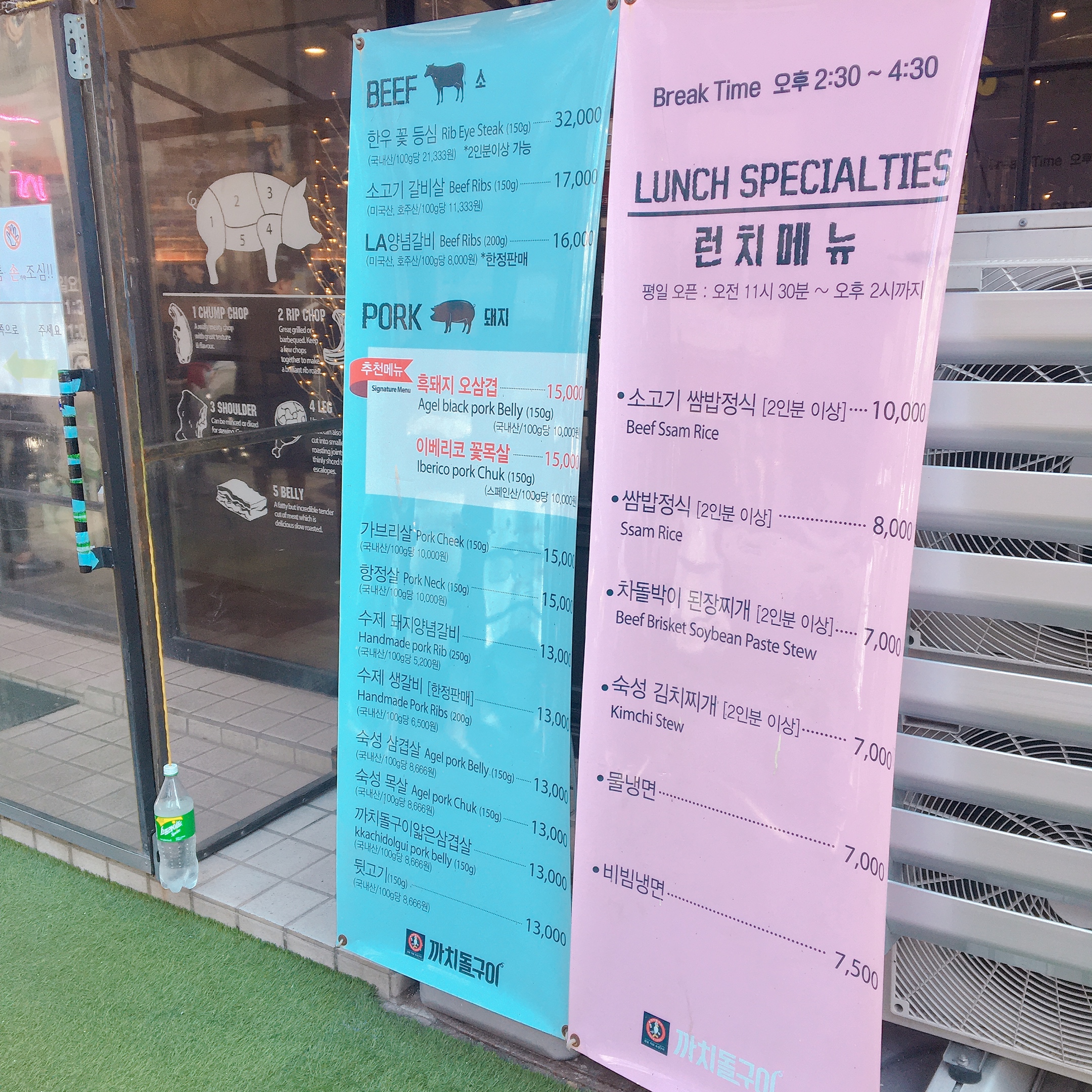 이날은 점심에 먹으러 갔기 때문에 고기류 말고 오른쪽에 보이는 런치메뉴 중 소고기 쌈밥정식을 시켰습니다.