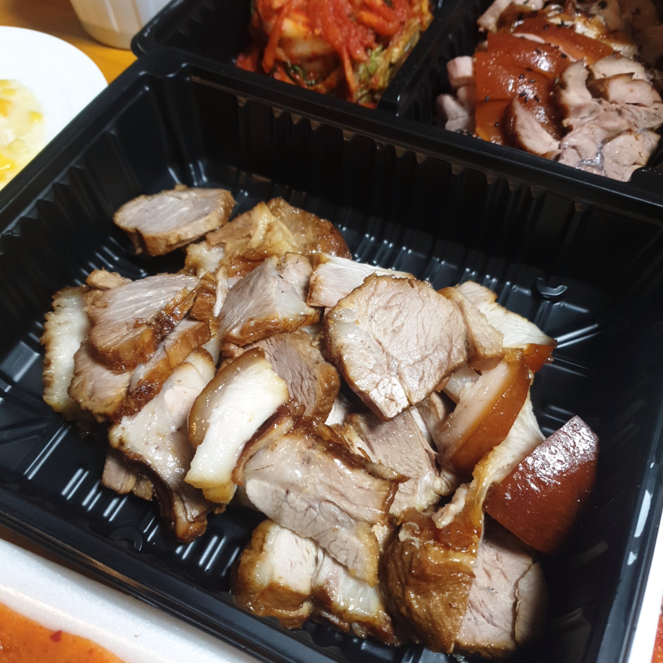 이 집 족발과 보쌈의 가장 큰 특징은 돼지 잡내가 안납니다. 포장해서 온 다음에 이거저거 하느라 시간이 좀 흘러서 먹어서 좀 식어서 먹었는데도 살코기 부분도 부드러웠고 껍데기, 비계부분도 탱글탱글하니 맛있었습니다.