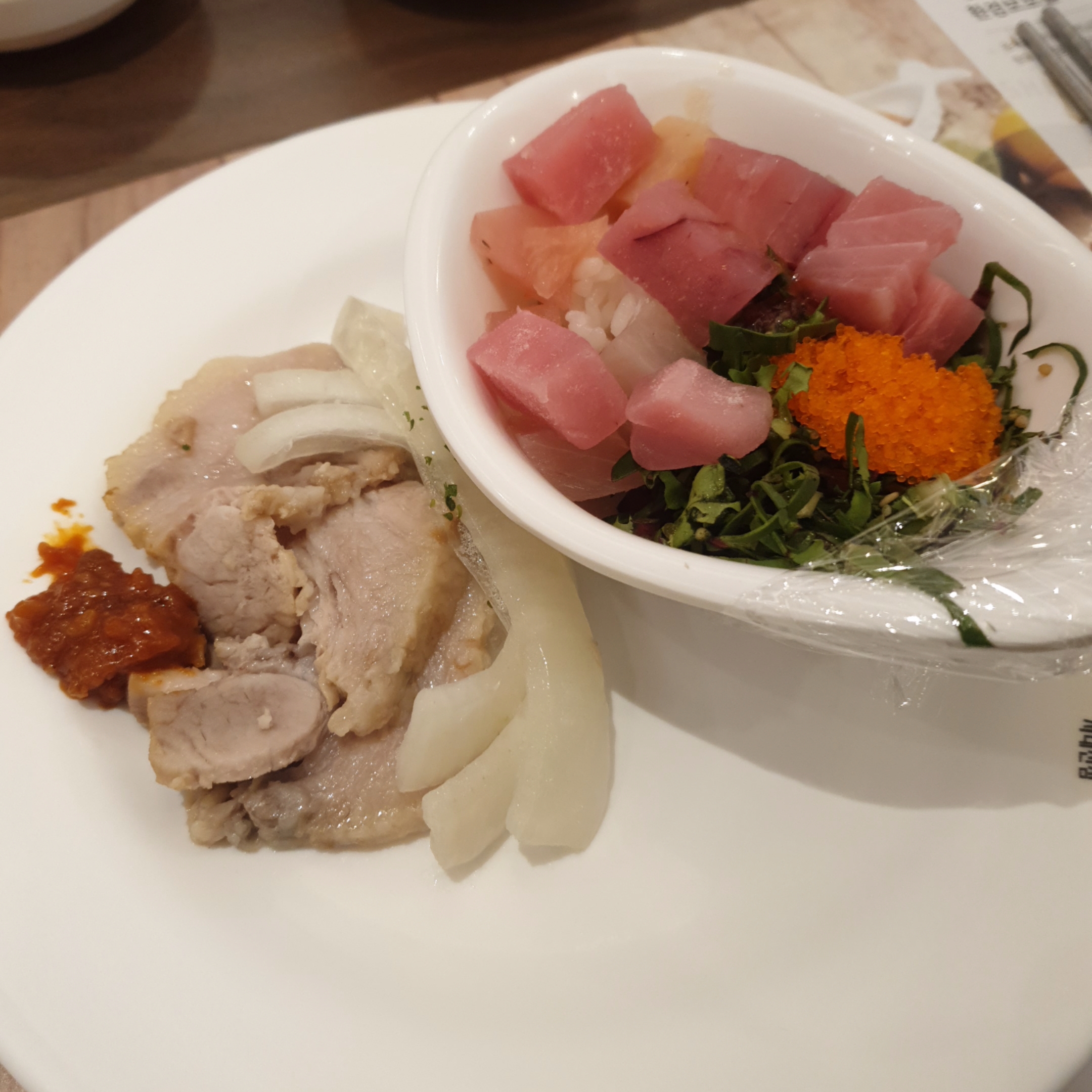 마지막으로 회덮밥으로 마무리했는데, 원래 담겨있는 그릇에다가 위에 소개드린 네모난 참치회를 더 얹어서 가져왔습니다.