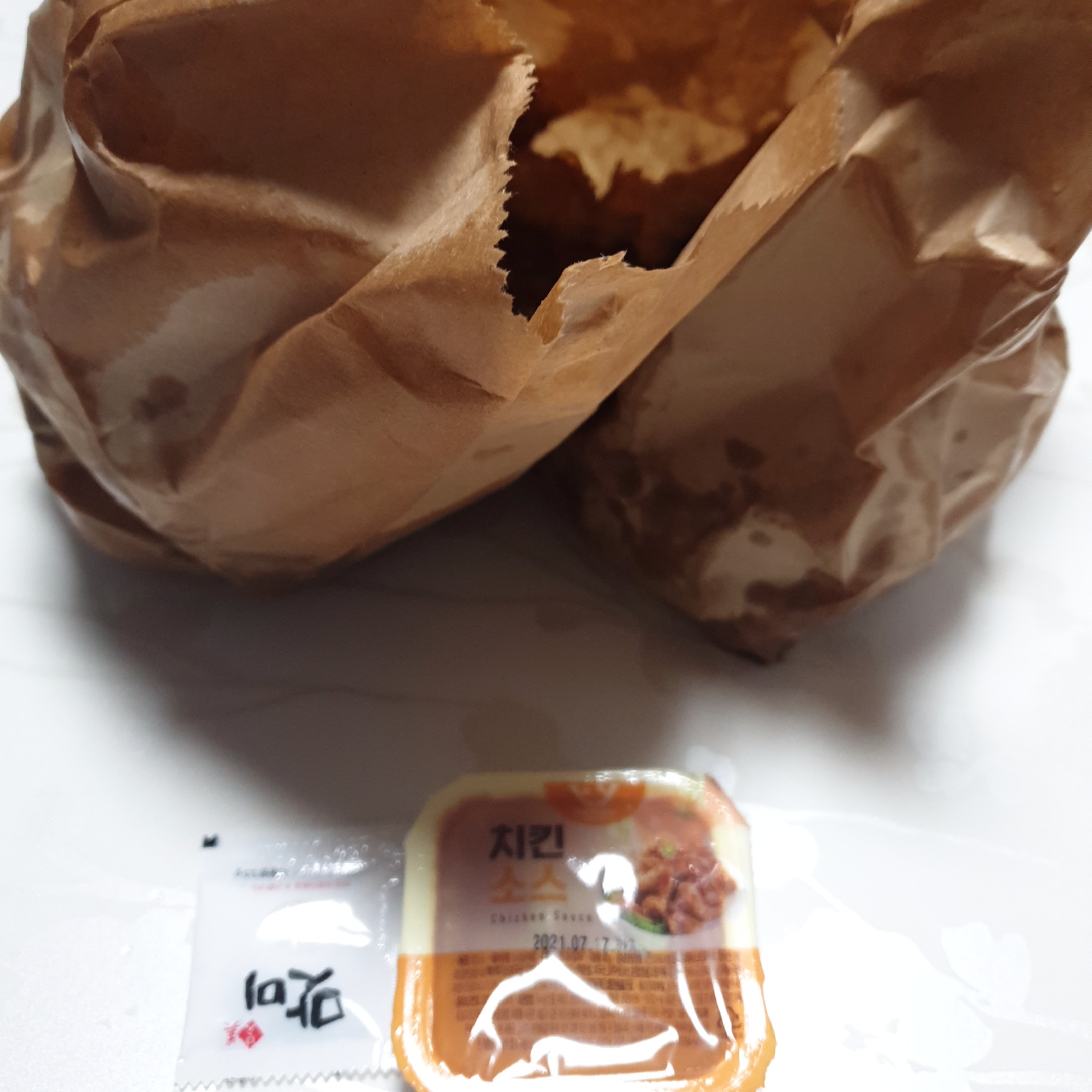 보이는 왼쪽이 옛날통닭 들어있는 봉지, 오른쪽이 순살 들어있는 봉지입니다.